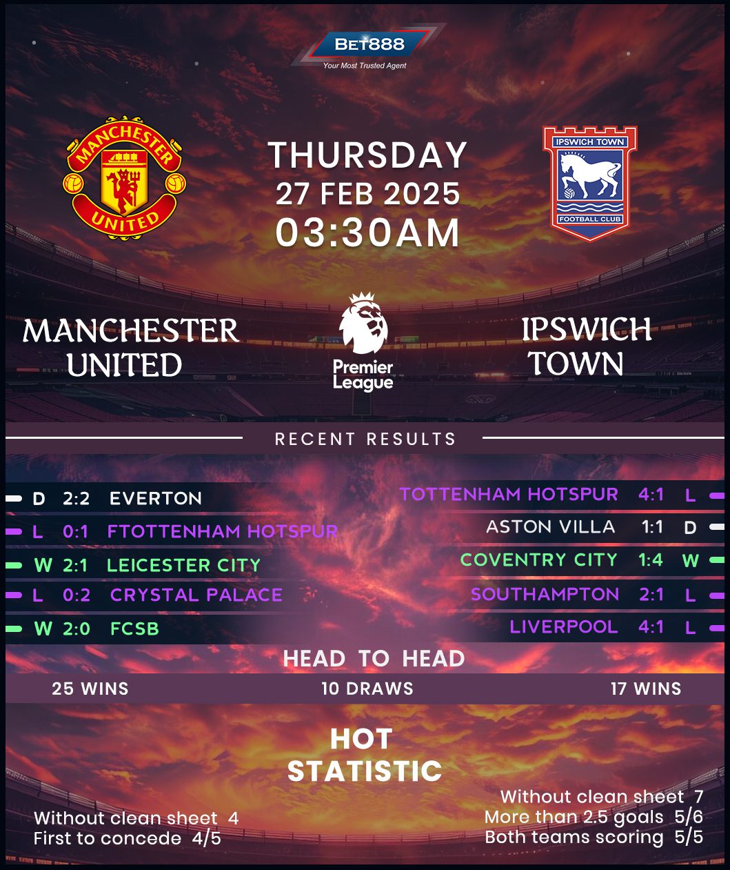 On the other hand, Ipswich’s bid to avoid an immediate return to the Championship faced another setback at the weekend as Tottenham trounced them 4-1 at Portman Road, extending their winless run in the Premier League to seven matches (D2, L5). Boss Kieran McKenna returns to the Theatre of Dreams as a foe, bidding to inspire the Tractor Boys to their first league triumph on Man Utd’s home ground since 1984. However, the visitors have failed to beat United across their last six H2Hs at this venue (D2, L5), losing the most recent three via an aggregate score of 15-0.