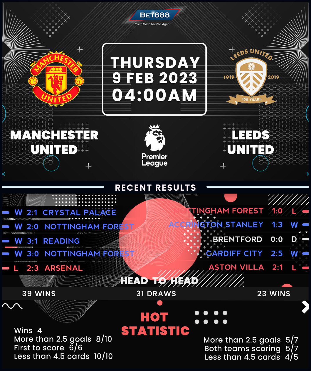 Despite Casemiro’s second-half expulsion, Manchester United claimed a 2-1 home win over Crystal Palace last weekend, extending their winning streak at home to 13 consecutive matches in all competitions. While the longest winning run since a club-record 19 home triumphs in 2011 under Sir Alex Ferguson looks promising, Casemiro’s absence is a potentially ominous sign for the hosts. Erik ten Hag’s men have lost three of their four competitive matches without the Brazilian in the line-up this season. However, the ‘Red Devils’ boast a formidable home form against Leeds, having gone unbeaten in their last 17 league H2Hs at Old Trafford (W11, D6). On top of that, only Manchester City (16) have netted more Premier League goals against Leeds than Man Utd (15) since the Whites’ top-flight return in 2020.