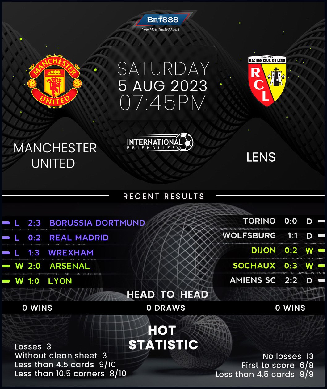 In the meantime, visiting Lens have fallen victim to their outstanding success last season as they finished runners-up to PSG in an enthralling Ligue 1 title race. Standout performer Lois Openda and captain Seko Fofana have left the club this summer, perhaps contributing to Lens’ less impressive run of back-to-back friendly draws against Wolfsburg and Torino. Both stalemates featured a goalless halftime score in matches garnering under 2.5 total goals, highlighting the potential for a low-scoring affair. However, highly-rated manager Franck Haise won’t be bothered by aesthetics if his men extend an eye-catching 13-game unbeaten streak (W9, D4), stretching back to a 3-1 defeat away to PSG in mid-April.