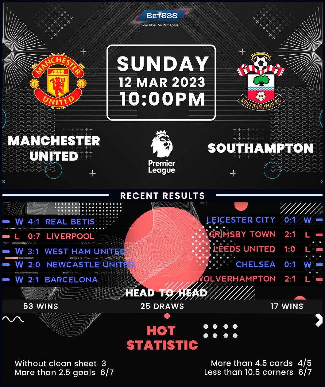 Manchester United picked themselves up from a humiliating 7-0 defeat to arch-rivals Liverpool last weekend by ousting Real Betis 3-1 at home in midweek Europa League action. Despite falling down from a four-game undefeated run in the Premier League (W3, D1), Erik ten Hag’s men must be confident of returning to winning ways at Old Trafford, where they’ve gone unbeaten in their last 20 competitive outings (W18, D2). Adding to this sentiment, the ‘Red Devils’ have had Southampton’s number of late, holding the ‘Saints’ winless in 14 consecutive H2Hs in all competitions (W7, D7) since a 1-0 home loss in 2016. They’re likely to paint the continuation of that impressive streak with flying colors after netting 2+ goals in all but two of their matches in 2023 (W14, D3, L2).