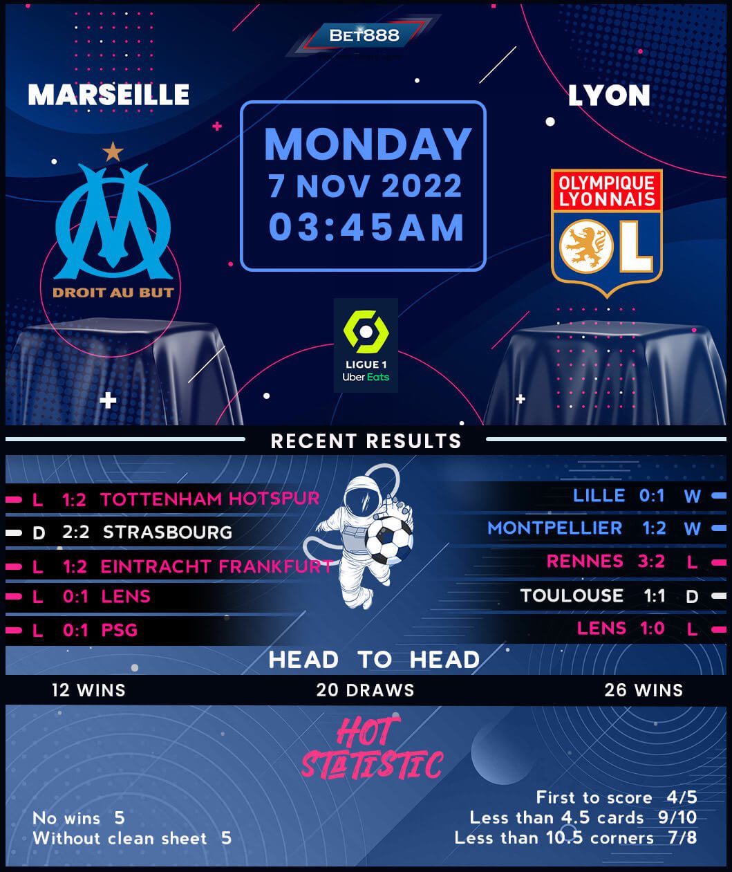 Marseille must shrug off the stress following a heartbreaking Champions League group stage elimination induced by Tottenham Hotspur’s come-from-behind 2-1 win at the Velodrome in midweek. While it looks frustrating at first glance, it could prove a blessing in disguise for out-of-sorts ‘Les Olympiens,’ who drew 2-2 at Strasbourg last time out to snap a dreadful three-game losing streak in Ligue 1. Head coach Igor Tudor needs to stem the bleeding as soon as possible to keep Marseille in the top-three race, with his side still within a three-point distance of third-place Rennes, courtesy of a stellar nine-game league start (W7, D2). However, the hosts have found it almost impossible to beat Lyon lately, picking up just one victory in their last 15 top-flight H2Hs (D6, L8).