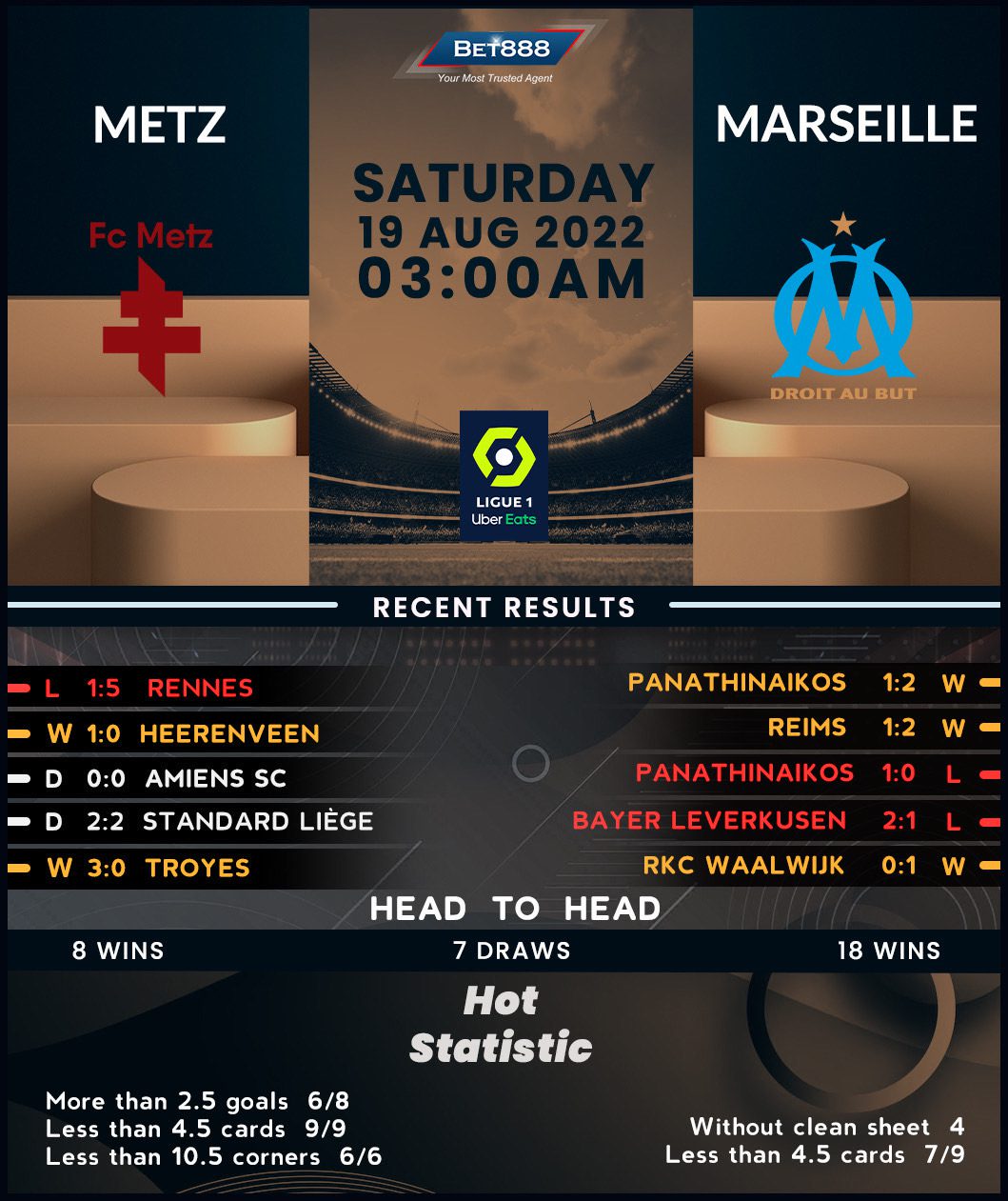 In the meantime, Marcelino’s managerial tenure at Marseille was off to a flying start as ‘Les Olympiens’ came from behind to beat last season’s Ligue 1 surprise package Reims 2-1 on the opening weekend. However, Marcelino’s fairytale turned into a nightmare in midweek Champions League action, with Panathinaikos crashing his side out of the third qualifying round. Given they’ve had little time to recover from a heartbreaking European loss, Marseille would be correct to doubt their bid to arrest a three-game losing streak away from home in Ligue 1. If it’s any consolation, they’ve emerged victorious twice on their last four top-flight visits to Metz (D2) despite only managing one clean sheet in this run of H2Hs.