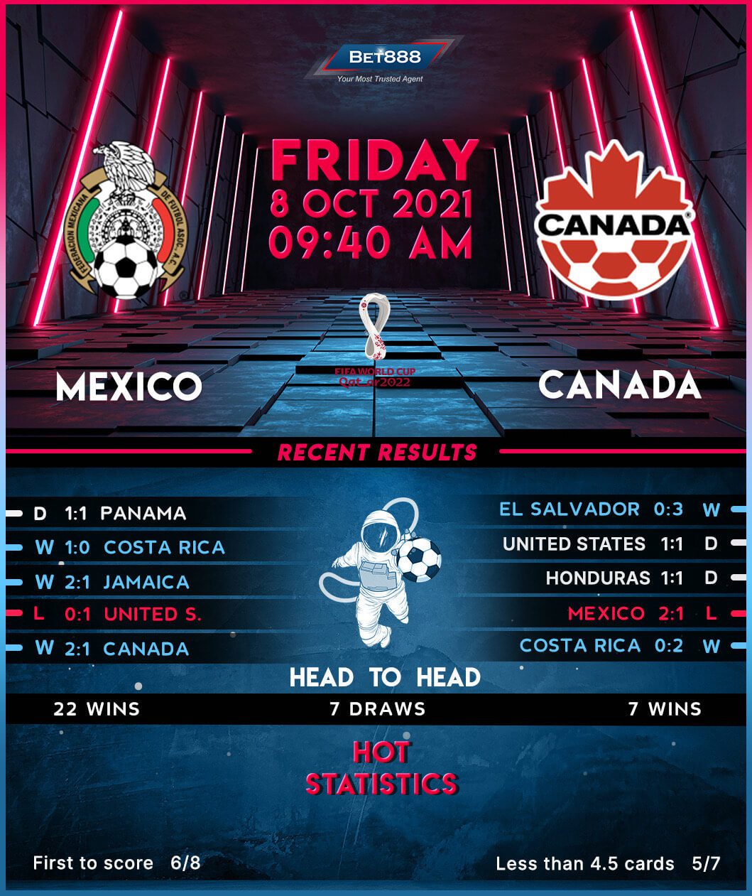 In the meantime, Canada responded to back-to-back 1-1 draws with Honduras and the United States at the start of their World Cup qualifying campaign with an overwhelming 3-0 home victory over El Salvador last time out. Including the preliminary rounds, the ‘Canucks’ are unbeaten in their nine World Cup qualifiers for Qatar 2022 (W7, D2), returning a resounding +33 goal difference for good measure (GF:36, GA:3). However, a trip to Mexico might stir some painful memories, as they’ve lost all five World Cup qualifying visits to this country by an aggregate scoreline of 14-1. Alarmingly, four of those five defeats have come by at least a two-goal margin. End-to-end action remains on the cards, though, as three of Canada’s last four competitive fixtures have seen both teams score.