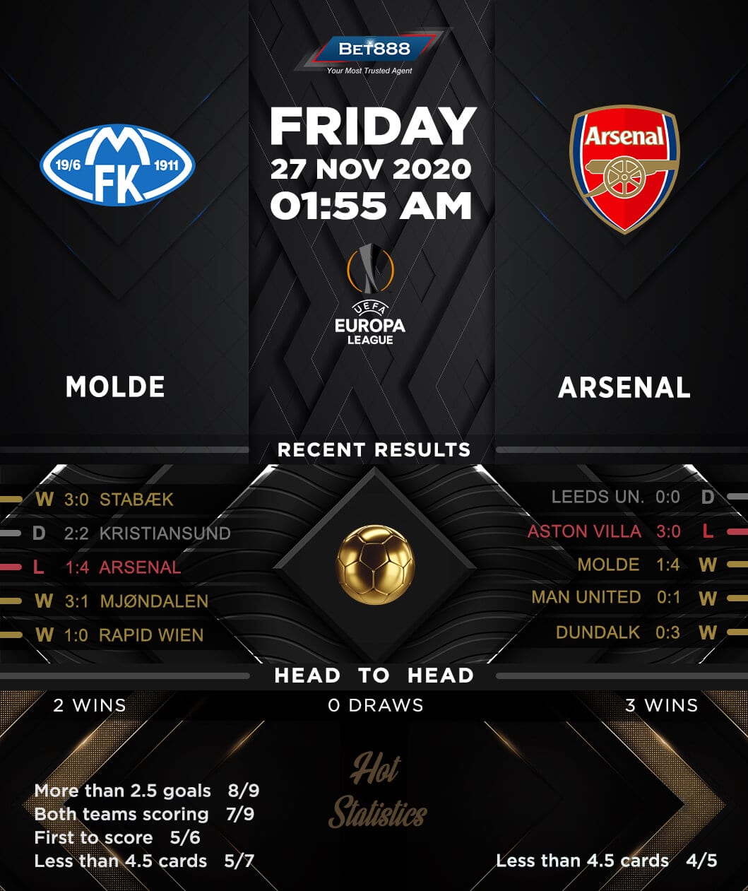 Arsenal will be looking to maintain their unbeaten record against Norwegian clubs (W4, D1) when they meet Molde at the Aker Stadion in the UEFA Europa League.