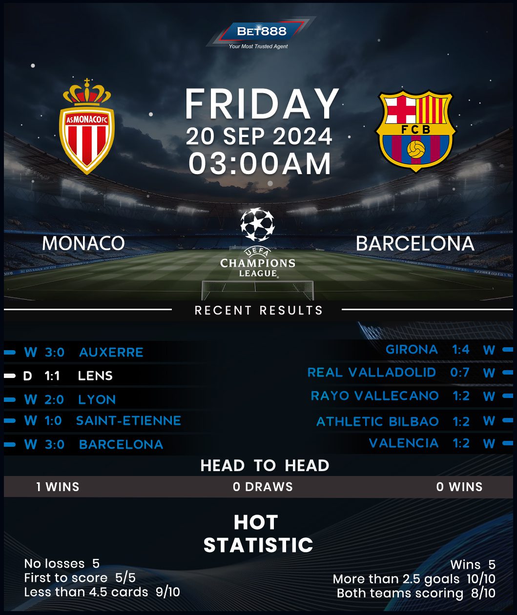 Monaco’s impressive first season under German boss Adi Hutter has earned them a return to the Champions League main phase for the first time since 2018/19, as they finished runners-up to PSG in Ligue 1 last term. Despite facing high-flying Barcelona in their opening fixture, the French giants will take the field in high spirits amidst a four-game unbeaten league start (W3, D1), capped off by a 3-0 rout of Auxerre at the weekend. With more high-profile clashes against Arsenal and Inter Milan waiting down the road, Les Monégasques must start on the front foot, and history backs them to do just that. Indeed, Monaco’s outstanding run of just one defeat across their last nine home encounters against Spanish visitors (W7, D1) can inspire confidence within Hutter’s camp, with Monaco facing long odds in this blockbuster showdown.
