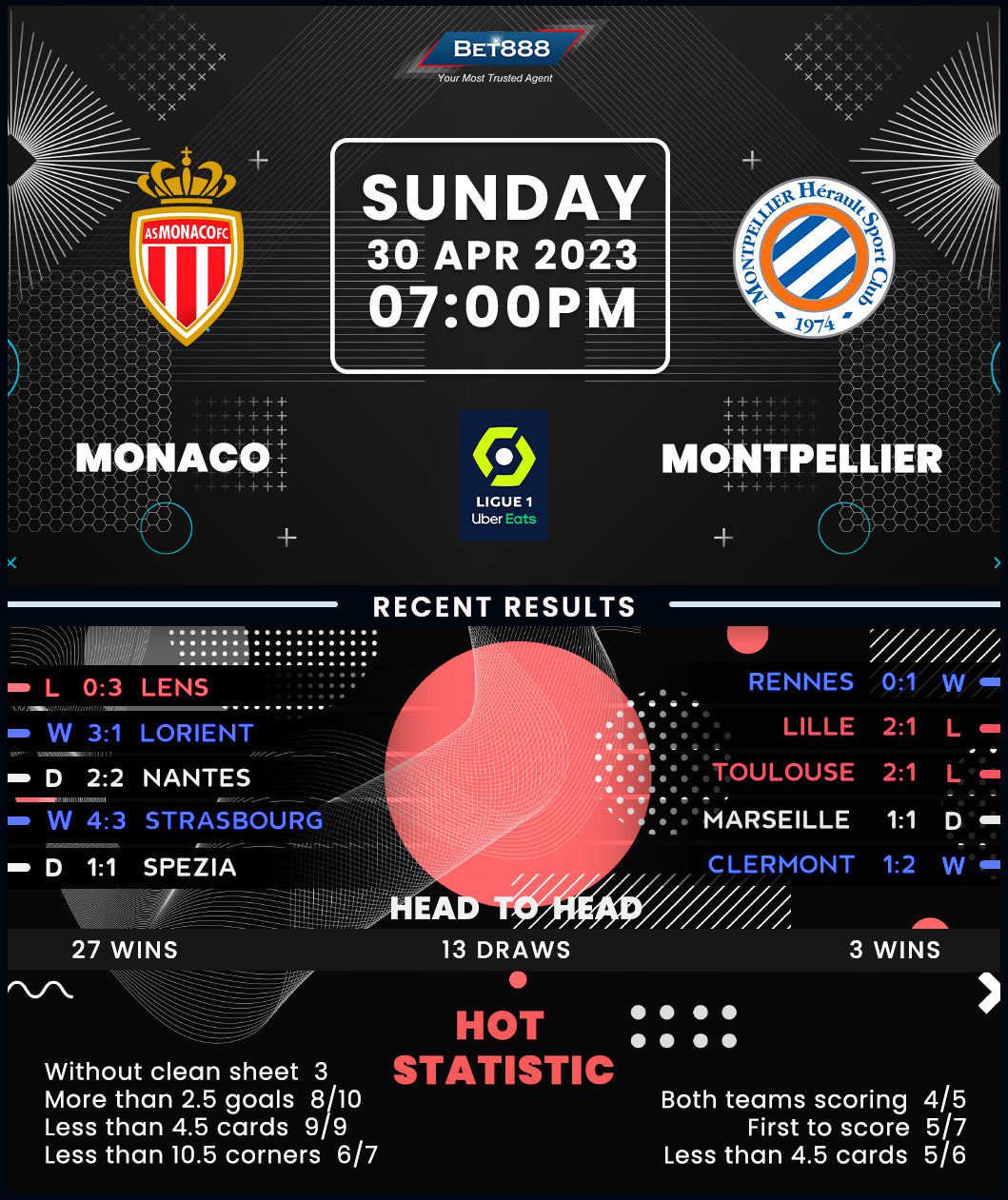 A woeful 3-0 defeat at Lens last weekend knocked Monaco down from a four-match unbeaten Ligue 1 run (W3, D1), significantly derailing their chances of qualifying for next season’s Champions League. With five points separating them from a coveted third spot, ‘Les Monégasques’ must quickly regroup as they meet a Montpellier side they’ve lost to only twice in their 28 top-flight encounters on home turf (W17, D9), most recently going down in 2018. Philippe Clement’s men have at least turned their home fortunes around in the build-up to this clash, going from three straight competitive losses to back-to-back victories by an aggregate score of 7-4. Those scoring exploits highlight the potential for a goal-glutted affair, with a 3-1 win in this corresponding fixture last season backing such claims.