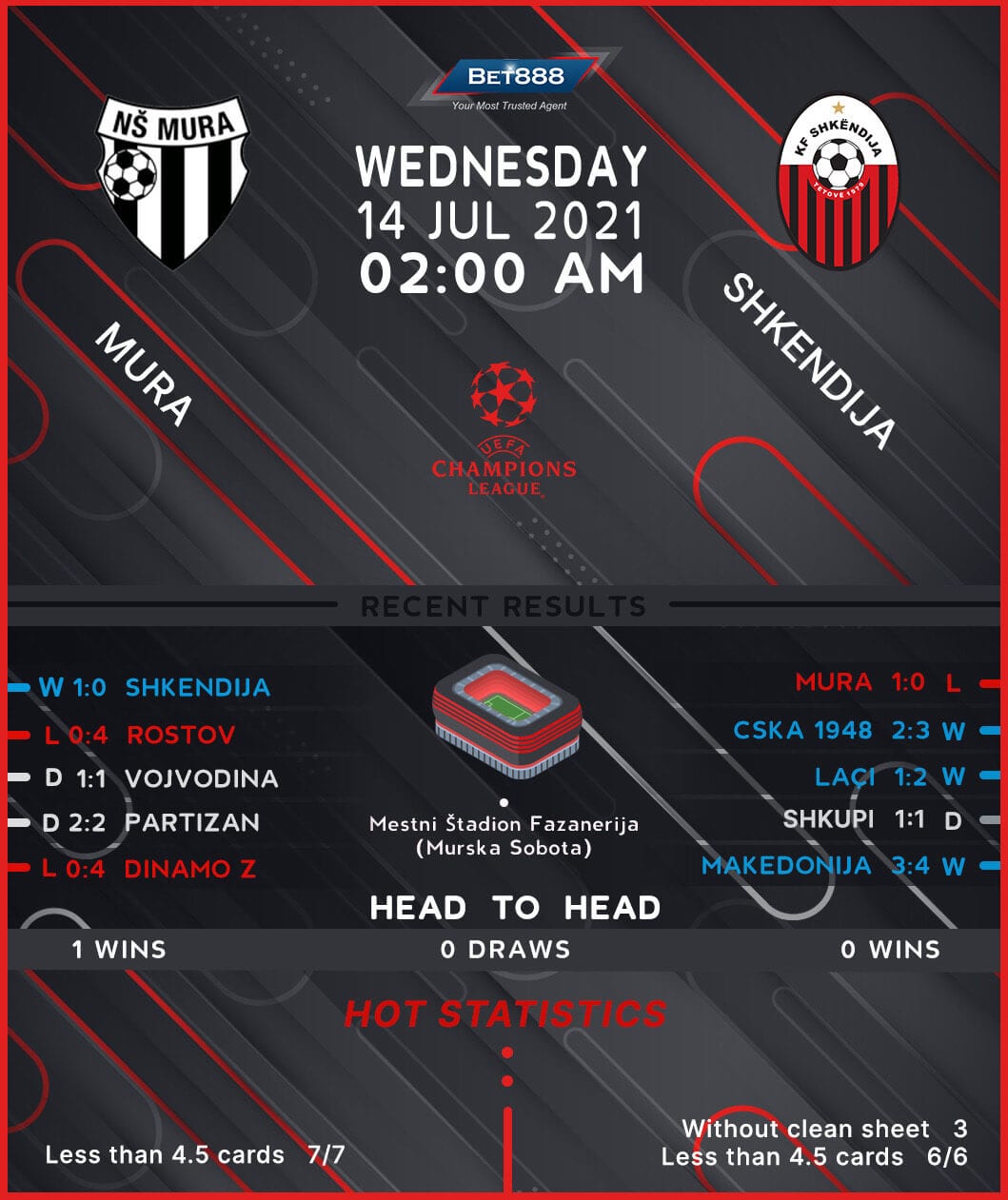 Shkendija head to the Mestni Stadion Fazanerija to take on Mura in the return leg of their Champions League qualifying tie, hoping to overturn a 1-0 first-leg deficit.