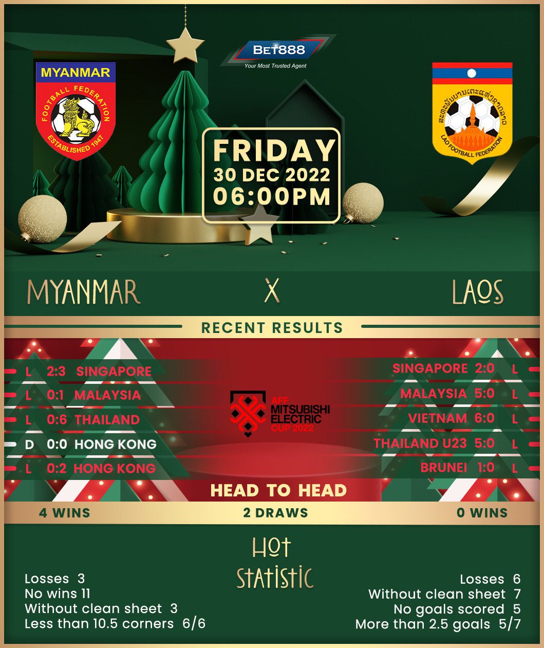 Time’s running out for Myanmar’s bid to progress into the AFF Championship knockout rounds after back-to-back group-stage eliminations. Following a narrow 1-0 loss to Malaysia on day one, the ‘Chinthe’ suffered a 3-2 defeat to Singapore last time out and now start round three six points adrift of the qualification spots. Myanmar’s underwhelming form stretches far beyond the tournament as they head into proceedings having lost ten of their last 11 internationals (D1), failing to get on the scoresheet in eight (73%) of those matches. But after beating Laos in their two most recent competitive H2Hs via an identical 3-1 scoreline, they’ll be confident about getting back to winning ways for the first time since December 2021.