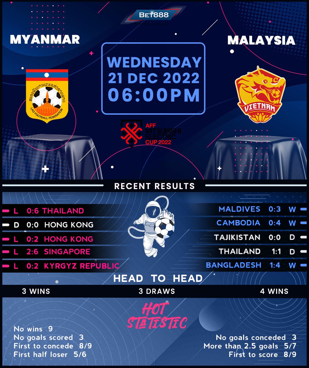 On the other hand, Malaysia may have suffered a heartbreaking penalty-shootout defeat to Tajikistan in September’s King Cup grand final, but they’ve bounced back impressively. The ‘Tigers of Malaya’ have won both international friendlies in December via 3+ goals ‘to nil,’ sinking the likes of Cambodia and the Maldives in the process. That should inspire their effort to avoid another group-stage elimination at the AFF Championship, as was the case in 2020, and get to the throne for the first time since their only previous success in the competition back in 2010. However, they have experienced mixed fortunes across their three AFF Championship meetings with Myanmar (W1, D1, L1), all of which saw one or both teams fail to find the net.