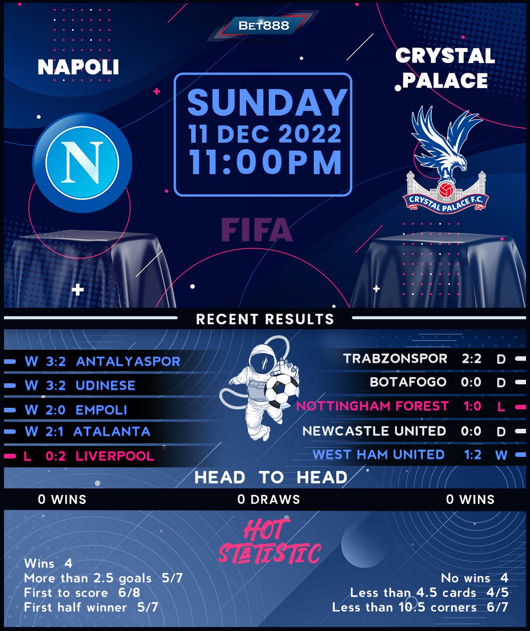 Napoli headed into the World Cup break as runaway Serie A leaders, having gone unbeaten in the opening 15 league rounds (W13, D2) to build a substantial eight-point lead on second-placed AC Milan. On top of that, Luciano Spalletti’s men secured progression into the Champions League knockout stages as Group A winners (W5, L1), highlighting their imperious form on multiple fronts. Not even a lack of several notable first-team stars was enough to knock ‘I Partenopei’ off their perch as they claimed an enthralling 3-2 victory over Antalyaspor a few days ago to extend their winning streak to four games. If there’s any downside for this high-flying Napoli team, then it’s the fact that their solitary defeat this season came at the hands of Palace’s fellow Premier League rivals, Liverpool.