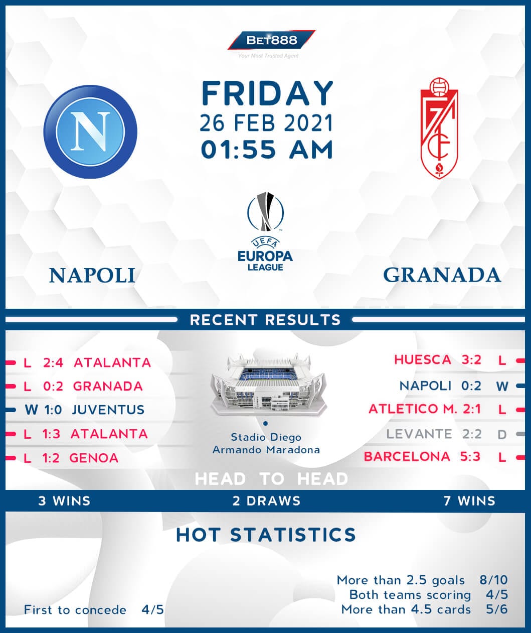 Granada have a two-goal edge as they travel to the Stadio Diego Armando Maradona to meet Napoli in the return leg of their UEFA Europa Leauge last-32 tie.