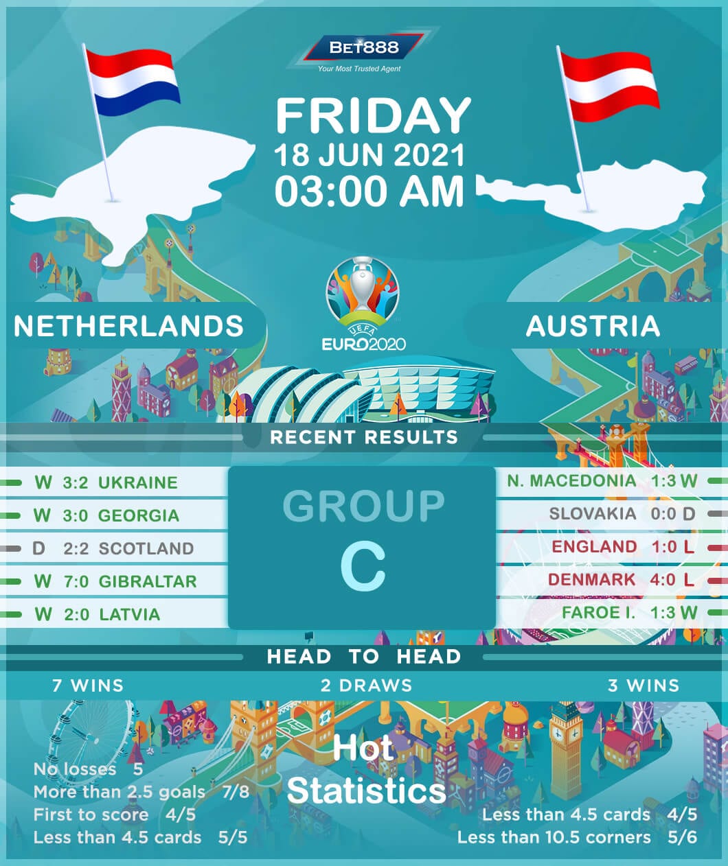The Netherlands prevailed 3-2 in a five-goal epic against Ukraine in their Group C curtain-raiser to put themselves in the driving seat to reach the knock-out stages of Euro 2020. Starting well will be a priority for the ‘Oranje,’ knowing they have come out victorious in all of the previous 21 international fixtures in which they opened the scoring, returning a resounding +59 goal difference from those wins (GF:66, GA:7). Additionally, the Netherlands have been relentless against Austria in their recent H2H battles. They have won each of their last six international meetings, twice as many triumphs compared to their 13 previous clashes against the Austrians (W3, D4, L6). What’s more, Ronald Koeman’s men head into proceedings having scored 2+ goals in each of their last eight international outings.