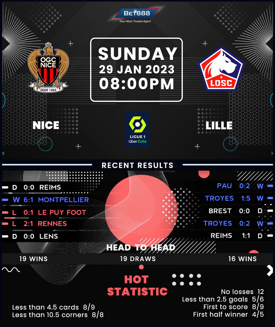 Nice parted company with long-serving manager Lucien Favre following a 2-1 defeat at Rennes at the start of 2023, handing Didier Digard an interim charge. The 36-year-old caretaker manager has repaid the club’s trust by delivering four points in his first two Ligue 1 games at the helm (W1, D1), including a scintillating 6-1 romping of Montpellier on his home debut. After losing three of their first four home matches in 2022/23 (D1), ‘Les Aiglons’ have gone unbeaten in their last five league outings on home turf (W3, D2), alternating between winning and drawing on each occasion. Their home resurgence could go on, considering they’ve suffered just one defeat in their last ten top-flight encounters against Lille at the Allianz Riviera (W4, D5).