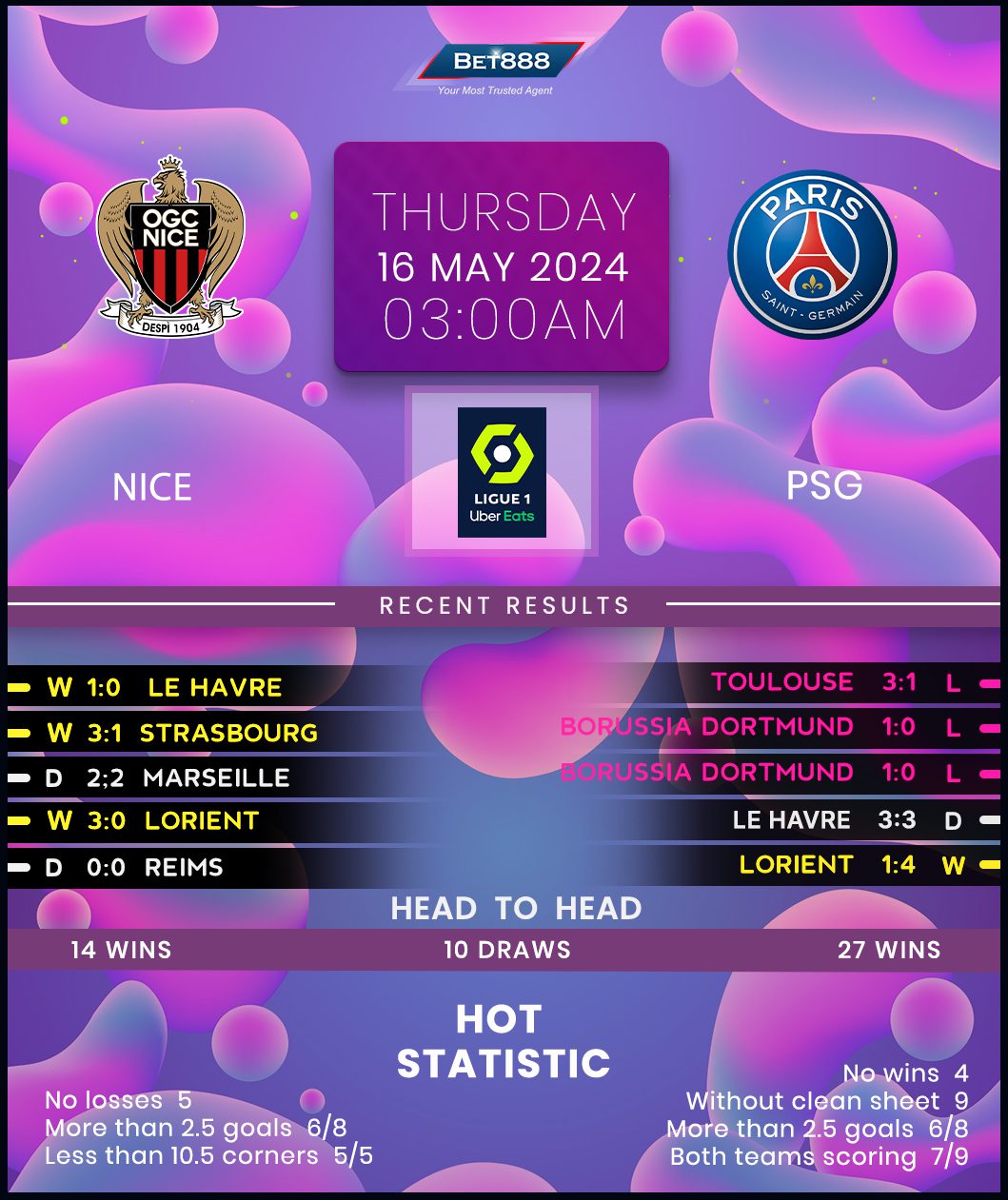 European qualification looks like a foregone conclusion for Nice in manager Francesco Farioli’s impressive first season in charge, but it’s uncertain in which competition they’ll feature next term. A four-point cushion on sixth-placed Lens means a positive result in this match-up would seal their berth in the Europa League, but a win could leave them in the Champions League picture, with fourth-placed Brest four points away. Confidence is high in the home camp following a five-match unbeaten league run (W3, D2), bookended by a narrow 1-0 home win against Le Havre last weekend. Back-to-back home league triumphs ‘to nil’ gives Los Aiglons hope that they could defy an underwhelming record of four defeats from their five most recent home meetings with PSG in Ligue 1.