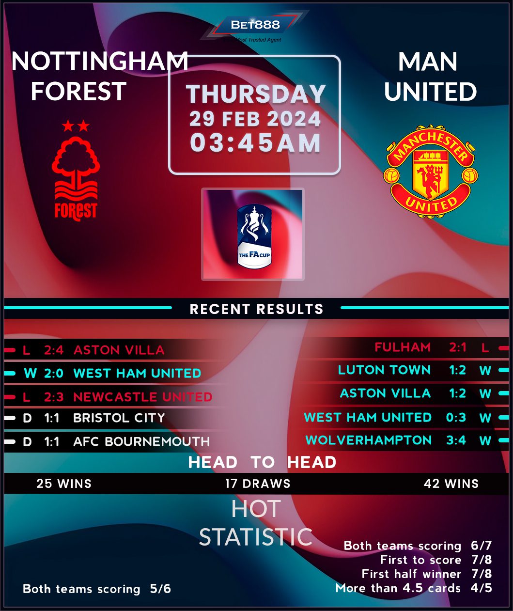 Nuno Espirito Santo’s honeymoon at the City Ground is over after a disheartening 4-2 defeat at Aston Villa last weekend left his Nottingham Forest flirting with the Premier League drop zone. Only four points clear of 18th-placed Luton Town, the Tricky Trees might find this FA Cup clash a welcome distraction, not least because they take on a Man Utd side they defeated 2-1 on this ground in December. That success made Espirito Santo the first Forest boss in the 21st century to take three points against United, halting the club’s disastrous 12-game winless H2H run in the process (D1, L11). However, Forest’s home form has descended into chaos since the calendar year flipped to 2024, with just one win from five outings at the City Ground (D2, L2 – 90mins only) casting further doubt on their prospects in this tie.