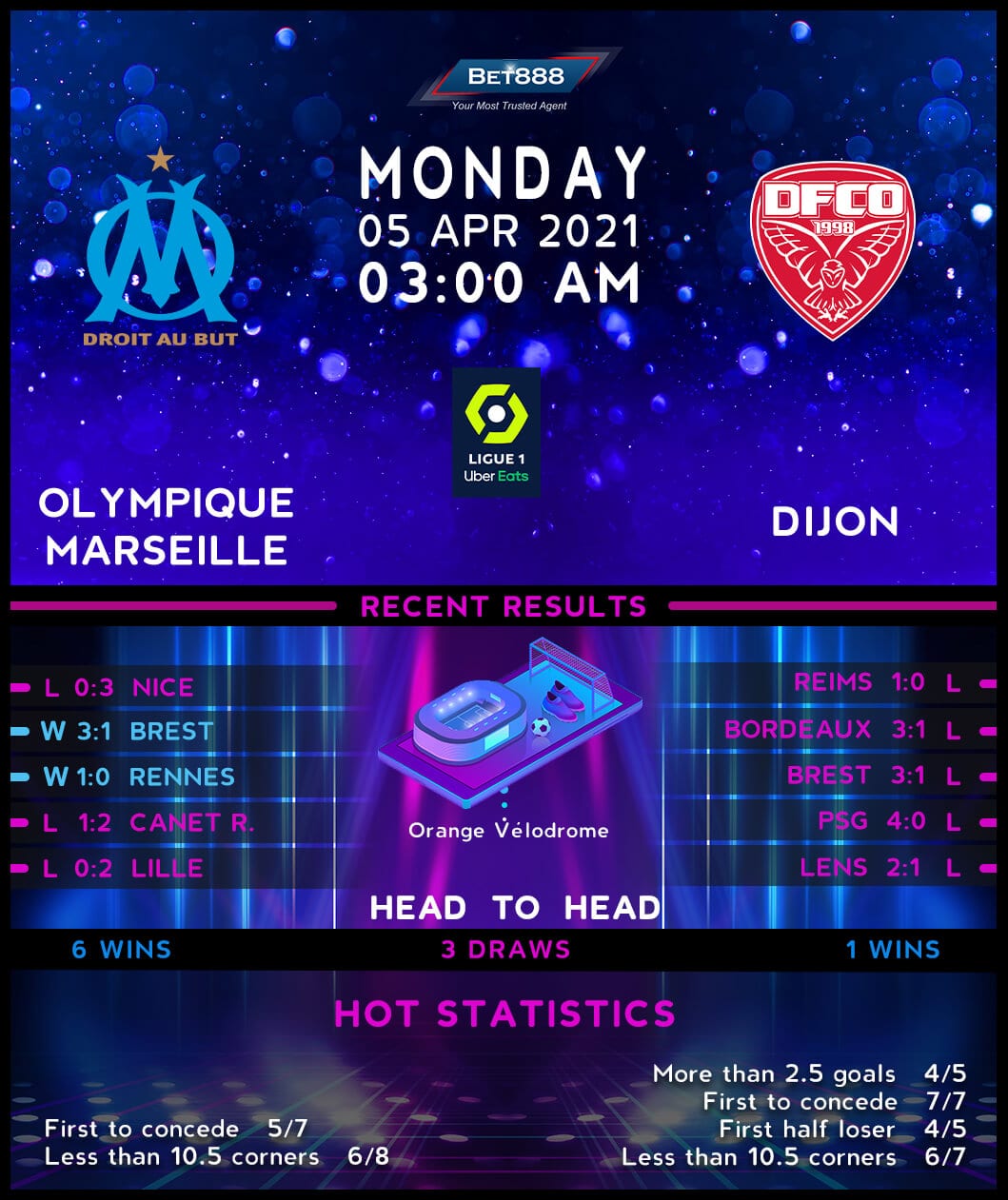 Dijon take the field after losing ten consecutive Ligue 1 matches – a sequence that nailed them to the bottom of the table, with the slimmest of chances of staying in the top-flight. Additionally, the visitors are the only side in Ligue 1 yet to win a single league game in 2021 (D3, L10), having scored the fewest goals (8) of all teams across Europe’s top-five divisions since the turn of the year. Topically, David Linares’ men have drawn a blank in three of their previous four Ligue 1 meetings with Marseille (D2, L2). Away from home, ‘Les Hiboux’ have lost their last five league fixtures by an aggregate score of 13-6, with the opening goal in each of them coming within 30 minutes of play. If that’s not enough of a reason for concern, they have conceded more goals on the road (29) than any other side this Ligue 1 campaign.