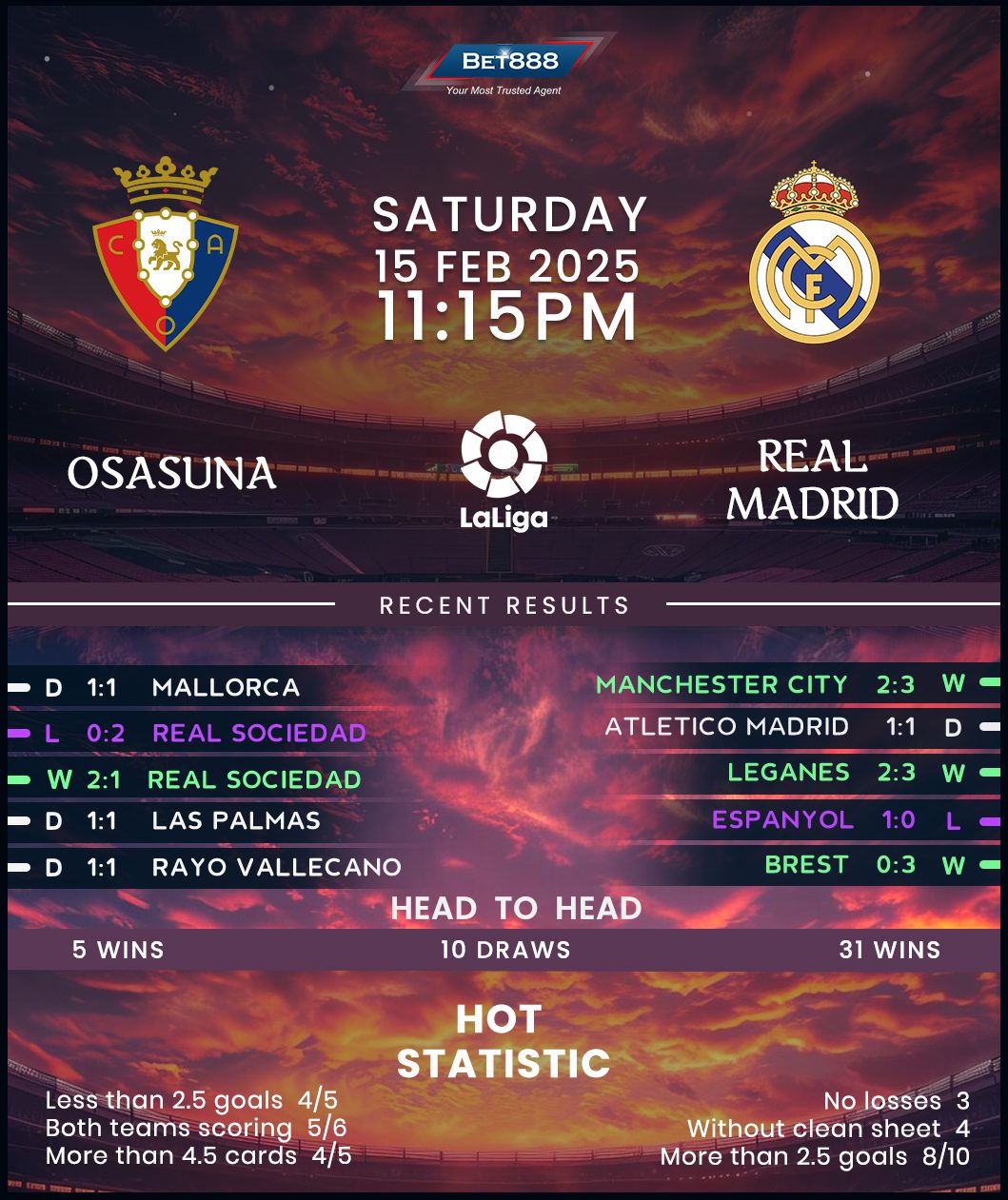 Meanwhile, Real Madrid will take this trip in a buoyant mood after hauling back an 86th-minute deficit to beat Manchester City 3-2 in the first leg of their Champions League knockout playoff tie. It was a perfect response to last weekend’s intense 1-1 home draw against fierce crosstown rivals Atletico Madrid. However, ‘Los Blancos’ are winless in back-to-back league games after a shocking 1-0 defeat at Catalan minnows Espanyol, which puts them at risk of losing consecutive away matches in La Liga for the first time since March 2023. That’s an unlikely scenario, not least because Carlo Ancelotti’s charges haven’t lost any of their last 22 top-flight meetings with Osasuna (W17, D5)!