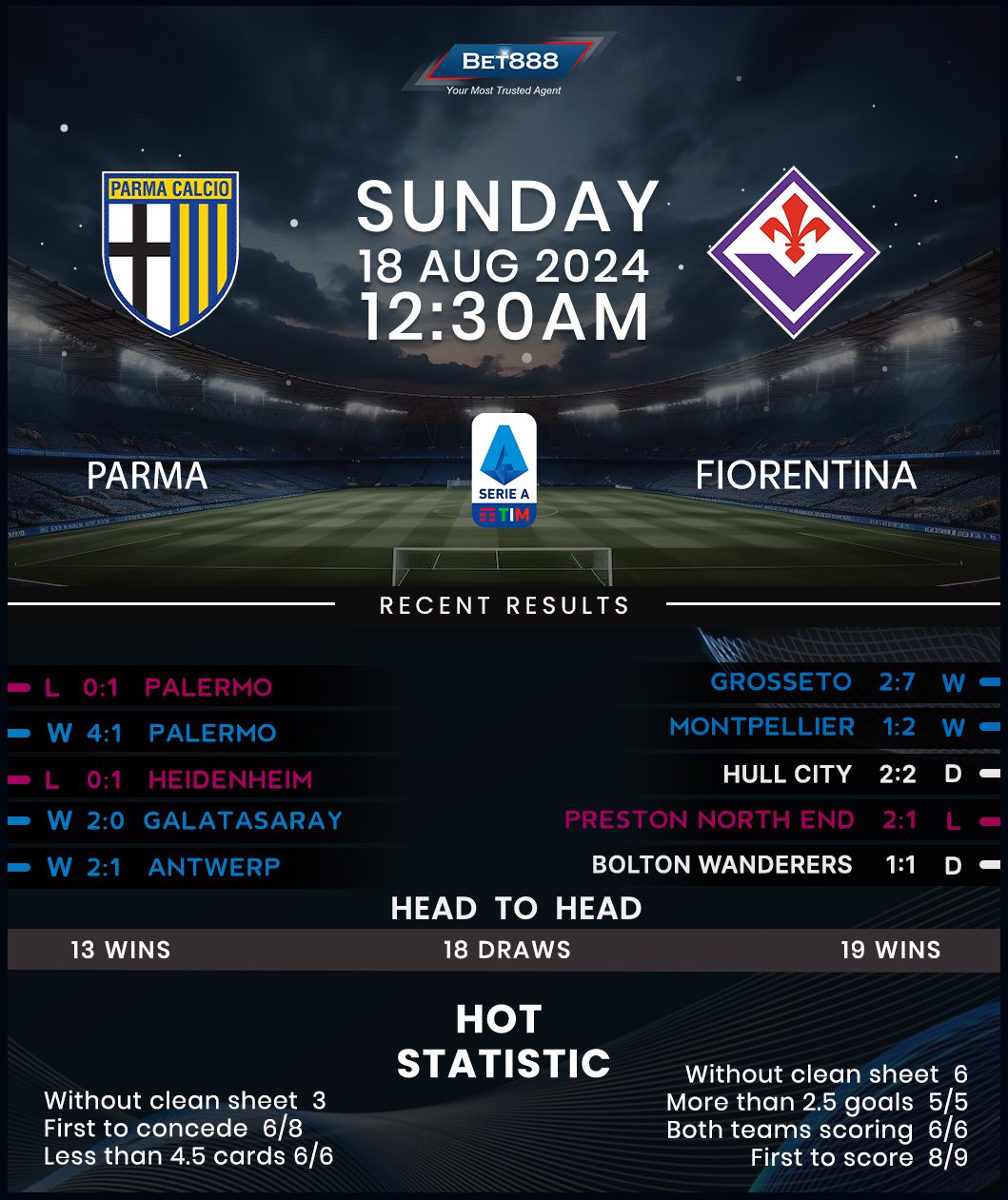 Newly-promoted Parma and Fiorentina are set to lock horns at the Stadio Ennio Tardini in their opening 2024/25 Serie A encounter.