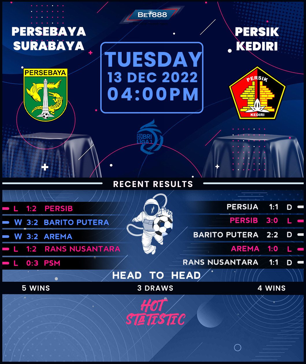 Gelora Bung Tomo Stadium is the venue, as Persebaya Surabaya and Persik Kediri go head-to-head in only their fourth-ever Indonesia Liga 1 clash.