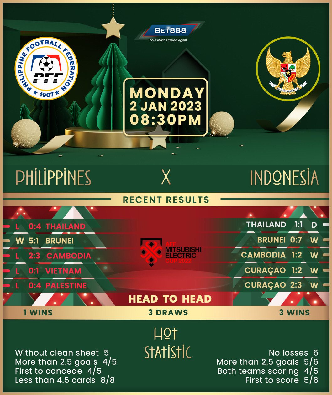 After a thumping 4-0 defeat to Thailand on matchday three, the Philippines’ hopes of making it out of the AFF Championship group stages for the first time since 2018 are officially dead in the water. Having lost two of their opening three Group A matches (W1), the ‘Street Dogs’ sit four points adrift of second-placed Indonesia at the start of the final round and cannot qualify for the knockouts, no matter the result. They can at least provide neutrals with more excitement, as their three games at the tournament thus far have all featured over 3.5 total goals. An action-packed first half is also on the cards, with each of those three games containing 2+ goals before halftime.