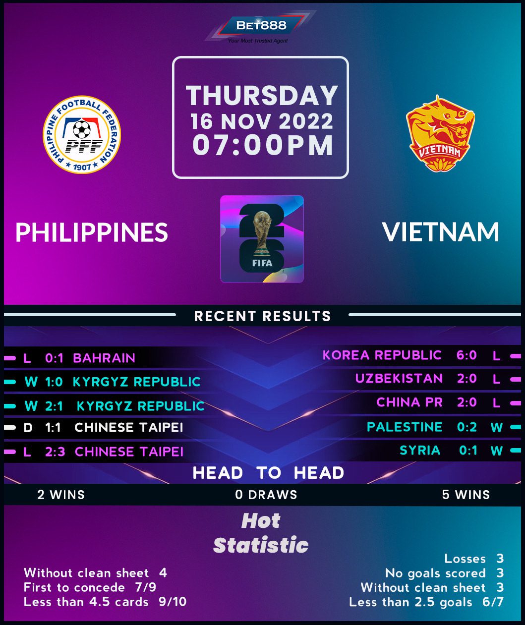 If the Philippines were to qualify for their first World Cup finals, a winning start against Vietnam is imperative, even though you’d need to go back to November 2012 for their last H2H win. They’ve since lost five consecutive encounters between the sides, ominously conceding multiple goals on four occasions. Avenging that dreadful streak looks like a tall order as Michael Weiss’ side relinquished a three-game unbeaten run (W2, D1) with a lackluster 1-0 loss to Bahrain in the run-up to this clash. The Philippines’ consistency issues have seen them alternate between winning (3) and losing (2) across their last five home internationals, casting further doubt on their effort to get their Group F campaign off to a winning start. But since four of those five matches featured over 2.5 goals and both teams scoring, this should be a fun contest.