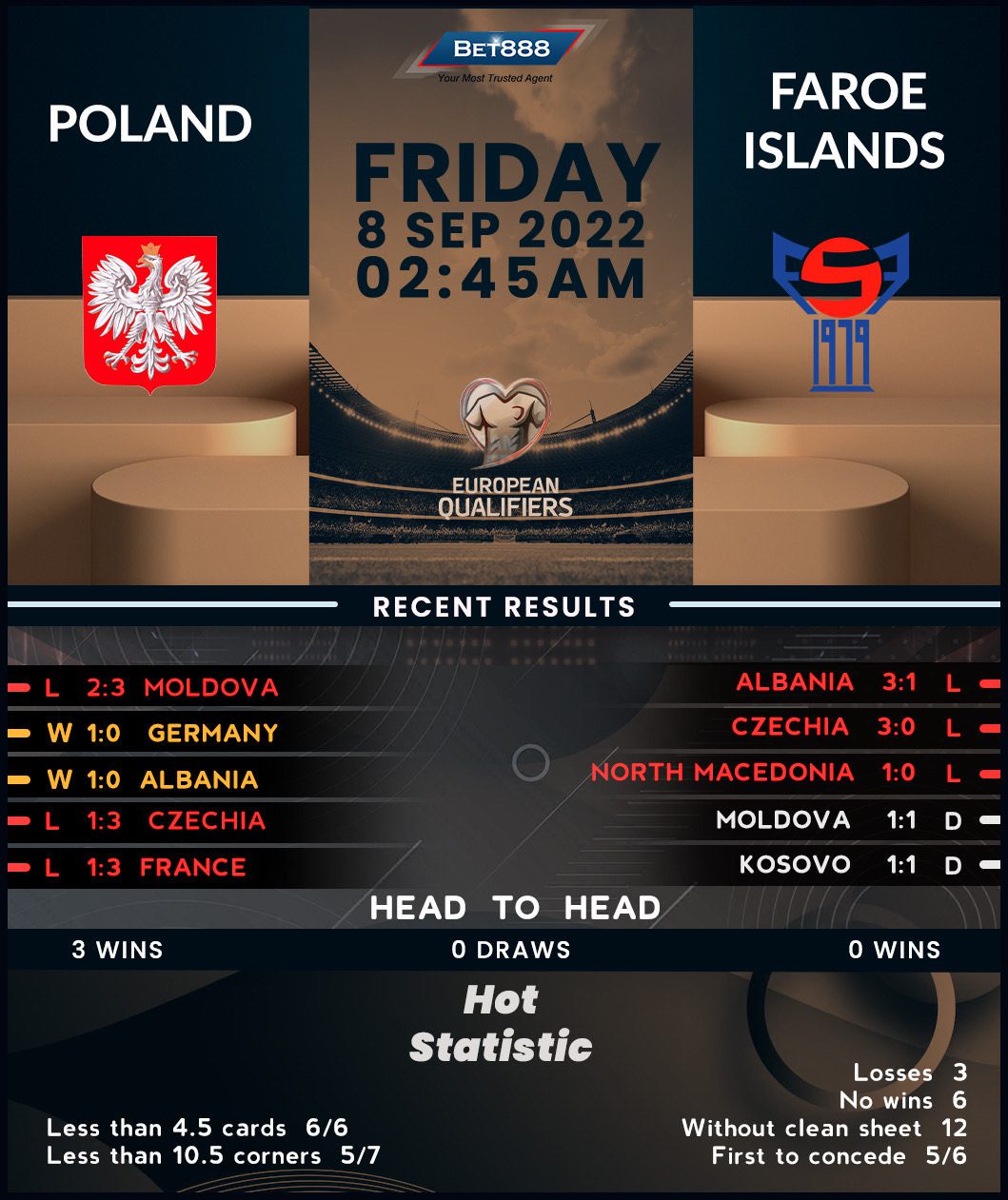 The visiting Faroe Islands can hardly throw a spanner in the works as they’ve lost back-to-back Group E matches to the Czech Republic and Albania, conceding precisely three goals on both occasions, following a 1-1 draw at Moldova in their opening Euro 2024 qualifier. Already nailed to the bottom of the standings, the visitors could be staring down the barrel of a third straight winless Euro qualifying campaign. Their hopes of avoiding that fate in Warsaw are as good as dead, at least based on the fact they’ve lost both previous encounters against Poland by 4+ goals ‘to nil.’ Furthermore, you’d need to go back to September 2020 for the Faroe Islands’ last win on the road, courtesy of a 1-0 triumph at Andorra. They have since gone winless in 17 consecutive internationals on hostile turf (D8, L9).