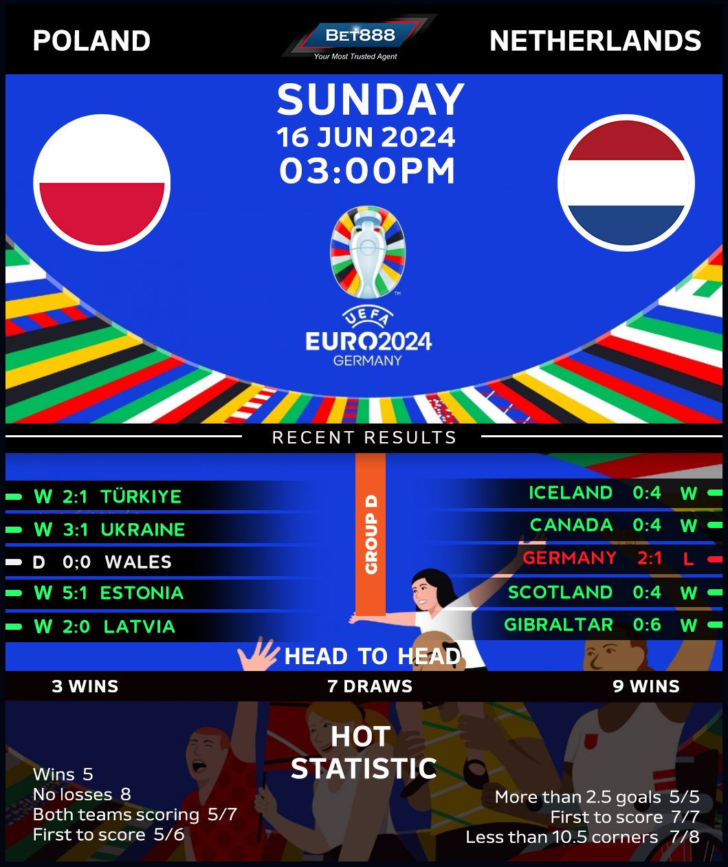 Poland’s ominous tradition of flaming out the group stages in three of their four previous appearances at the Euro tournaments spell trouble for the Eagles after becoming one of the latest teams to qualify for this summer’s competition. Paired with Austria, France, and the Netherlands in a highly competitive Group D, the Poles aren’t fancied to reach the knockouts, but there’s a silver lining. Since Michal Probierz was appointed the head coach last September, they’ve gone unbeaten in seven consecutive internationals (W5, D2), including a nerve-shredding penalty-shootout win over Wales to reach these finals. However, this could be a tall order for Poland, considering they’ve failed to beat the Netherlands across their last 12 H2H meetings (D5, L7), including a 2-0 defeat in their most recent encounter in the 2022 UEFA Nations League campaign.