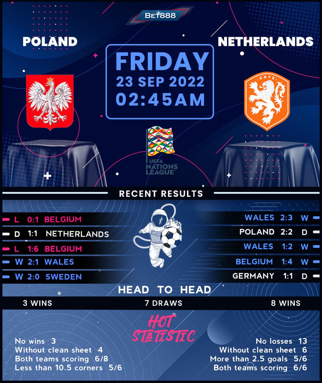 Poland’s 2-1 home win over Wales in a curtain-raising Group A4 fixture looks like a distant memory as Czeslaw Michniewicz’s men have since gone winless in all three Nations League matches (D1, L2). Heading into the final two rounds, the ‘Eagles’ can only hope for League A survival, and a win here would do the trick. However, that could be easier said than done, as they are winless in their last nine meetings with the Netherlands, including friendlies (D3, L6). Yet a ‘goal-friendly’ 2-2 draw in the reverse fixture on hostile turf may inspire Poland’s bid to claim their first H2H victory since 1979 and maintain their decent home run in the post-Euro 2020 period (W4, D1, L2). But since the inaugural Nations League edition, the Poles have only won two of their seven games in the competition (D1, L4).