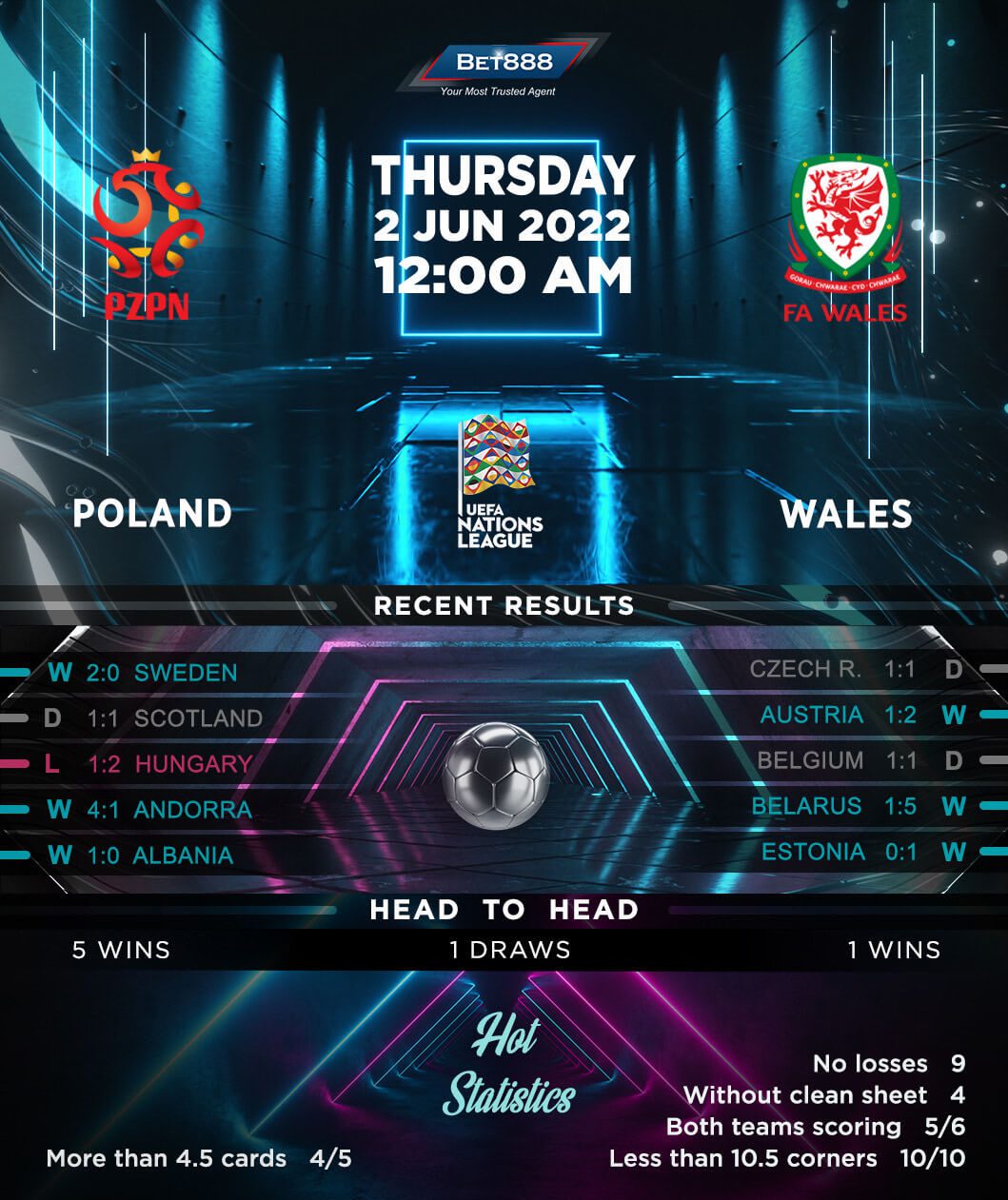 Placed in the same section alongside Belgium and the Netherlands, Poland will be seeking a flying start to their Group A4 journey. But based on their past experience in the Nations League, it could be easier said than done. It took Poland five winless matches since the tournament’s inauguration in 2018 before they pulled off their first victory. However, the Poles have the recent home form firmly on their side, with just one defeat from their last five outings on home soil (W3, D1), including a 2-0 triumph over Sweden in their most recent such fixture. Though the ‘White and Reds’ boast an eye-catching four-match winning H2H run, it’s worth noting that their last meeting with Wales dates back to 2009.