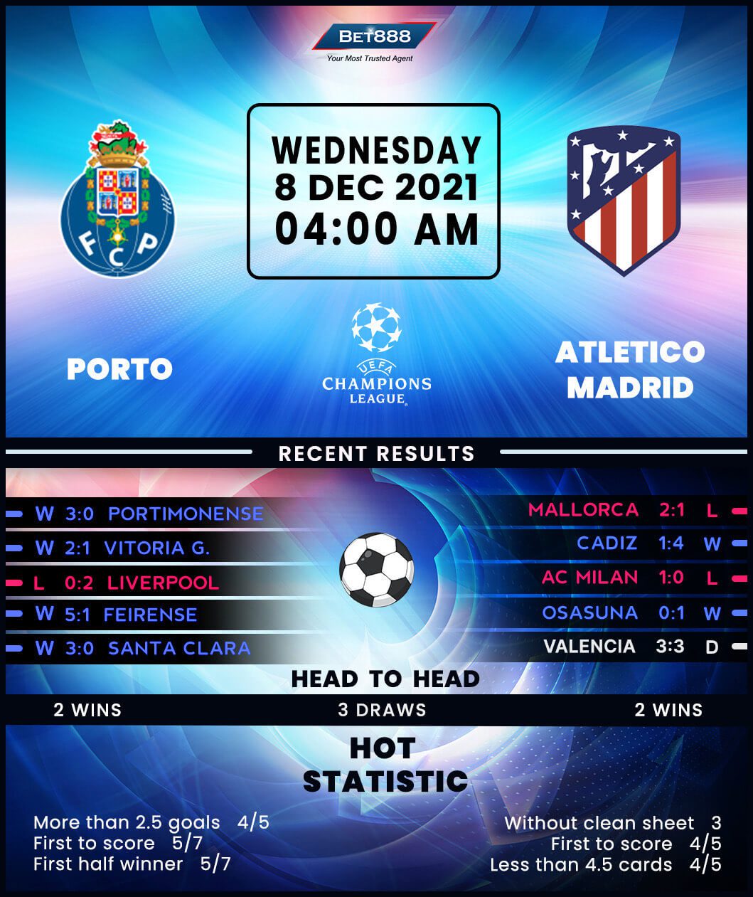 Porto could beat the odds and reach the Champions League knock-outs via a runner-up Group B finish if they can record a ninth win in their ten home games across all competitions in 2021/22. That’s despite winning just one of their five Champions League matches this season (D2, L2), courtesy of a 1-0 beating of AC Milan at home on Matchday 3. An uneventful scoreless draw in the reverse fixture in Spain kept Porto’s overall H2H European record versus Atletico Madrid balanced (W2, D4, L3). Adding to their confidence, they’ve only lost one of their four previous European home meetings with Atletico (W1, D2), keeping three clean sheets in the process. Topically, Sergio Conceicao’s men have registered four shutouts in their five Champions League home outings since the start of last season.