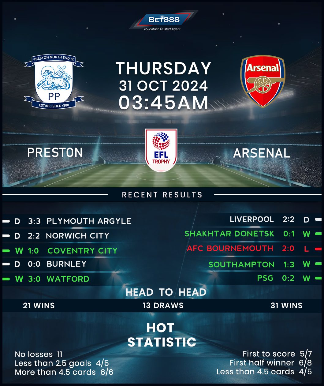 Following a comprehensive 5-0 win against lower-league Harrogate in the opening EFL Cup round, Preston stunned top-flight Fulham on penalties last time out to set up this tie. But despite their heroic performance against the Cottagers, the Lilywhites have only won twice in their subsequent seven Championship outings (D4, L1), including a goal-glutted 3-3 draw against Plymouth at the weekend. However, since a 2-0 defeat to Sheffield United on the opening Championship weekend, Paul Heckingbottom’s men have gone into overdrive at Deepdale, racking up an eye-catching seven-game unbeaten home streak in all competitions (W5, D2). Notably, they kept five clean sheets during that sequence, suggesting this won’t be a walk in the park for a more heavily fancied Arsenal.