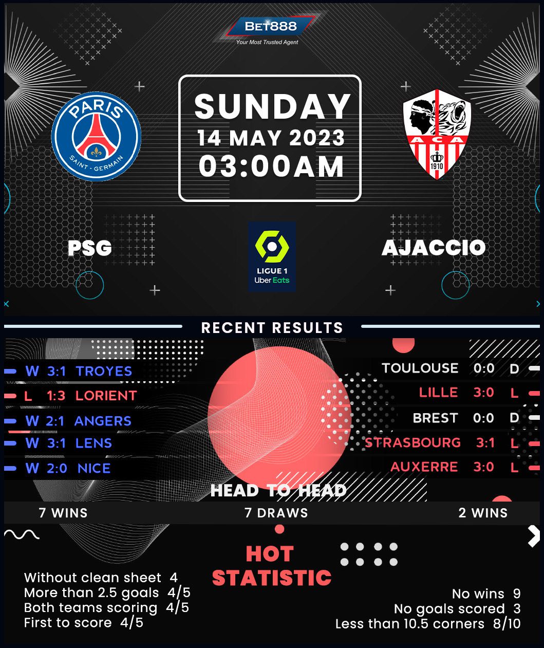 Anything other than victory in Paris will result in Ajaccio’s swift return to Ligue 2 after a dreadful run of nine winless league matches (D2, L7) left them a whopping 11 points adrift of safety. Scoring has emerged as the visitors’ biggest issue lately, as they’ve failed to get on the scoresheet in seven of their last nine top-flight outings, contributing to a league-low record of 22 goals scored in Ligue 1 this term. To better understand Ajaccio’s scoring problems, Kylian Mbappe alone (24) has netted more league goals than the entire visiting squad in 2022/23! It only gets worse away from home, where they’ve lost each of their last six league games by an aggregate score of 15-2, conceding precisely three goals on four occasions.