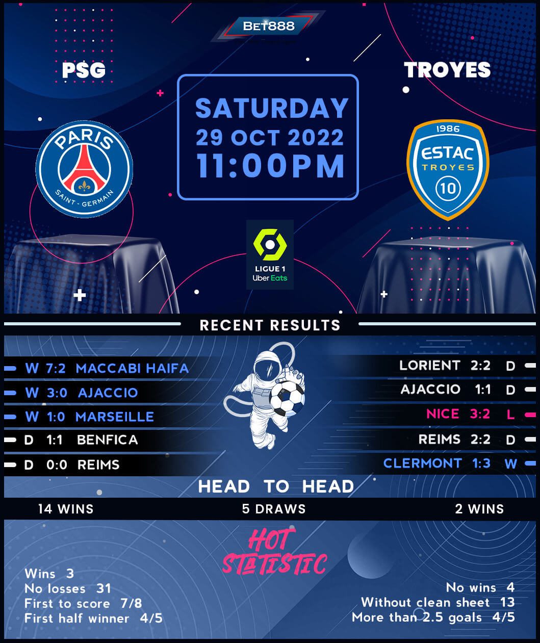 Meanwhile, visiting Troyes were pegged back twice in a goal-friendly 2-2 draw home draw with Lorient last weekend, extending their winless Ligue 1 streak to four games (D3, L1). The visitors’ underwhelming spell of form is likely to go on in Paris, where ‘Le ESTAC’ have been winless in their last ten top-flight matches against PSG (D2, L8). On the bright side, Bruno Irles’ men have racked up four victories across 16 league travels since the turn of 2022 (D3, L9), already equalling their highest tally in a single calendar year in Ligue 1. Staying compact at the back will be of paramount importance to Troyes’ effort to stage an upset, yet with zero clean sheets from their last 15 league H2Hs against PSG, that’s unlikely to happen.