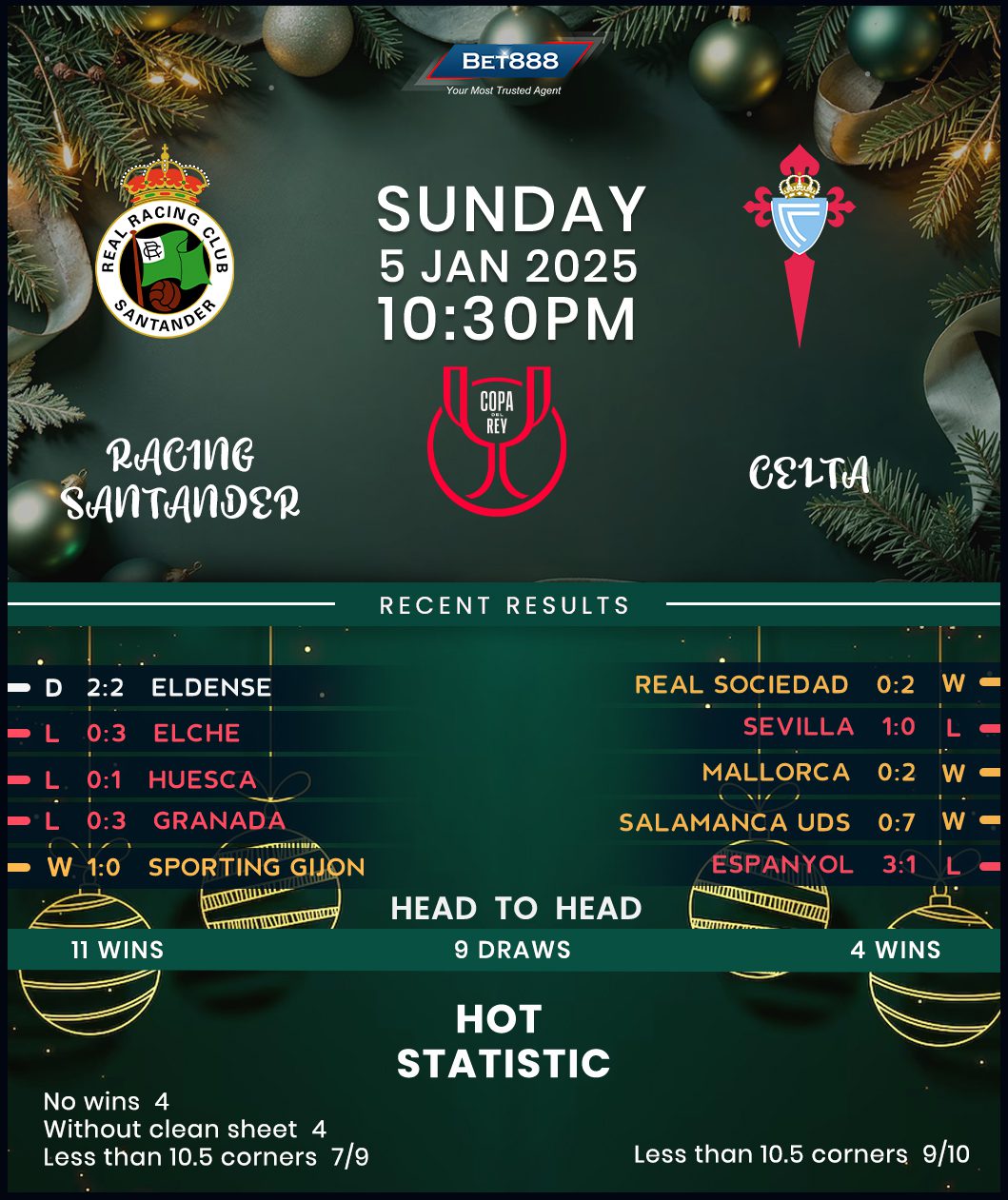 Racing Santander’s Copa del Rey campaign started with a goal-glutted 4-3 win against Lanzarote but quickly turned into a dramatic rollercoaster. Indeed, they needed the 78th-minute winner to beat Gijon 1-0. Their form has since plunged into chaos, with a 2-2 home draw against Eldense in their last league game in 2024 halting a dreadful run of three consecutive defeats without scoring. Notoriously inconsistent at El Sardinero, Jose Alberto Lopez’s men have alternated between different outcomes in their last seven home matches across all competitions (W3, D3, L2). A low-scoring theme has been the only common denominator, as six of those seven games featured under 2.5 goals. Another uneventful clash could be in store, knowing Santander’s last two home meetings with Celta produced only three goals combined (D1, L1).