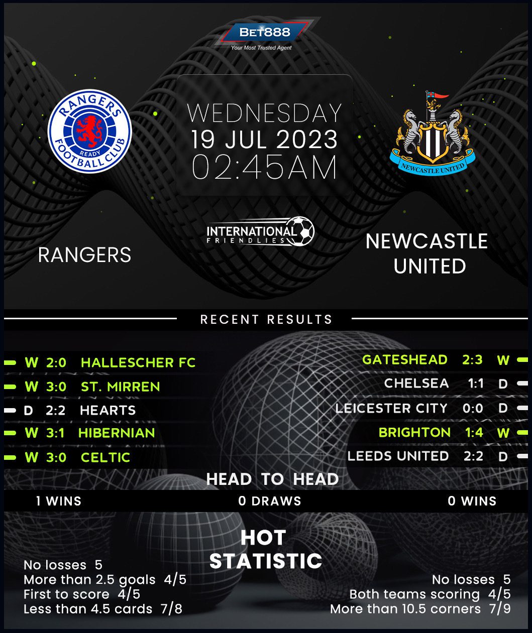 Rangers thumped St. Mirren 3-0 in the final round of the 2022/23 Scottish Premier League season to sign off with a five-game unbeaten league run (W4, D1). However, it was only enough for another runner-up finish but perhaps laid the foundation for a more promising future. Michael Beale’s men have impressively netted 2+ goals in their last four league outings, getting on the scoresheet on either side of halftime on each occasion. In addition to their outrageous scoring form, the ‘Gers’ have been rock-solid at the back, recording three clean sheets across their last five games. Against this backdrop, they’ve conceded in both previous friendlies against Newcastle, albeit they avoided defeat each time (D1, L1).