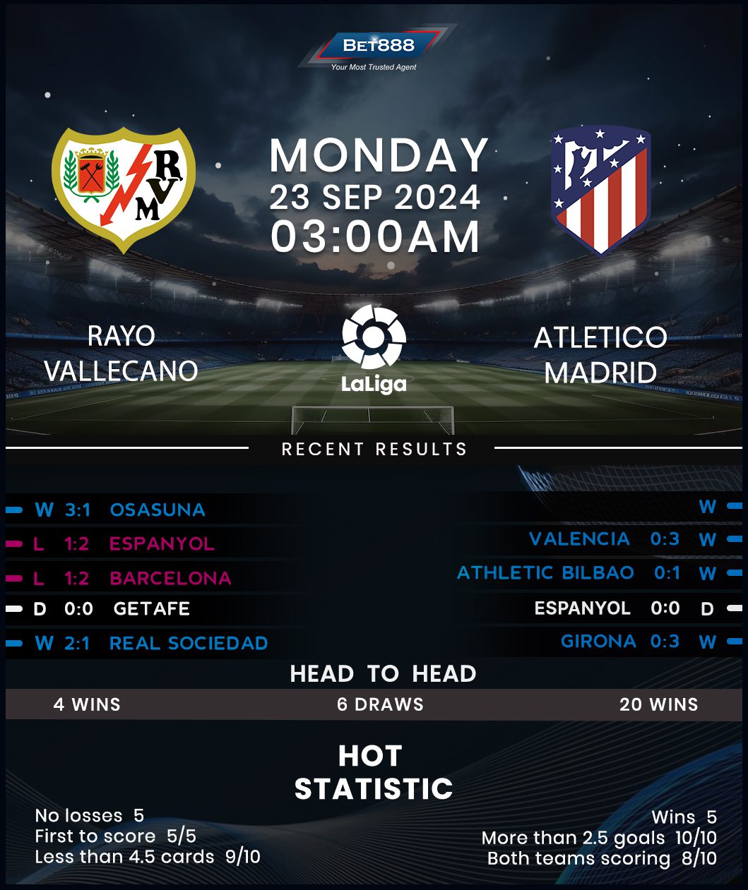 Atletico Madrid will look to maintain their unbeaten La Liga start when they take on Rayo Vallecano at the Campo de Futbol de Vallecas.