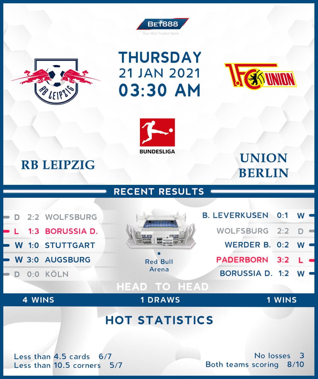 Red Bull Arena is the venue, as RB Leipzig and Union Berlin lock horns in their third Bundesliga meeting. Leipzig won both of their last season’s top-flight H2Hs, scoring seven times while conceding only once in return.