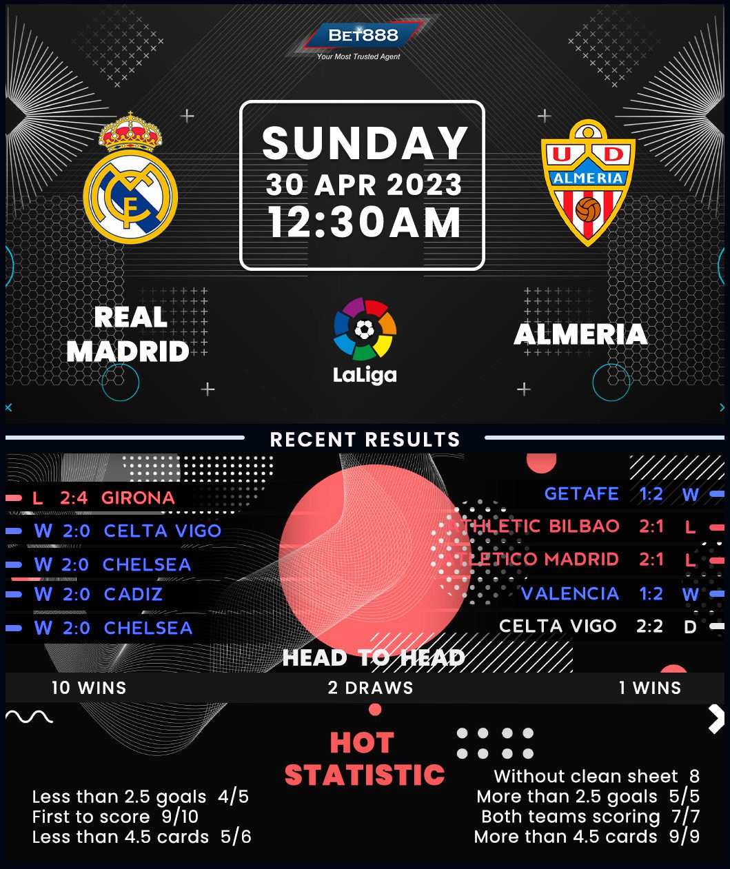 In the meantime, visiting Almeria scored on either side of halftime to topple Getafe 2-1 on the road last time out and arrest a two-game losing league run, steering two points away from the relegation zone. Yet that exact scoreline condemned them to defeat in the reverse H2H, extending their losing league run against Madrid to six games. Interestingly, that triumph at Getafe marked their first La Liga triumph on hostile turf this season, following a woeful run of 14 winless travels (D4, L10). Moreover, that was their first top-flight away victory over sides Comunidad de Madrid after going winless in their first 22 such match-ups (D5, L17). High scoring has been a common theme on Almeria’s recent domestic trips, as their last five away league matches saw over 2.5 goals and both teams scoring.