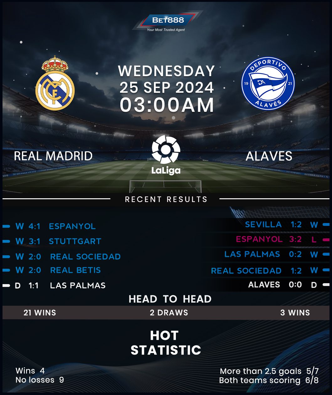 On the other hand, Deportivo Alaves enjoyed an impressive 2023/24 La Liga campaign, soaring to a 10th-place finish, and they’ve been equally remarkable at the start of the new season. A well-deserved 2-1 home triumph against Sevilla at the weekend made it four league games unbeaten in the opening six (W3, D1, L2), accounting for their best top-flight start since 2018/19. However, you’d need to go back to November 2020 for the last time Alaves triumphed in this fixture, suggesting their dream league start is about to experience a harsh awakening. Adding to this sentiment, Luis Garcia Plaza’s charges have massively stuttered on the road, picking up just two victories across their last ten La Liga travels (D2, L6).