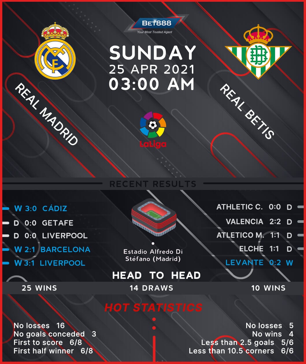 Real Madrid and Real Betis will trade tackles at the Alfredo di Stéfano Stadium as the hosts hope to continue to apply pressure on current La Liga pacesetters Atletico Madrid.