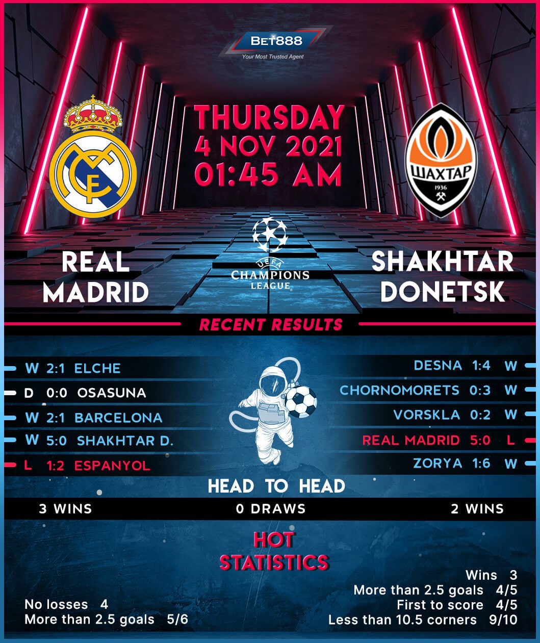 In the meantime, Shakhtar are staring in the face of adversity after being kept goalless in their opening three Champions League group stage fixtures this term (D1, L2). Trailing second-placed Madrid by five points going into this round, the Ukrainians may have to go for broke here to return in contention for a top-two finish. However, after failing to score in three consecutive away matches in the Champions League proper (D1, L2), the ‘Miners’ are going against the odds here. The one thing Shakhtar could find comforting is their impressive defensive form on the road, as they’ve kept a clean sheet in their last four road trips across all competitions (W3, D1). Another noteworthy takeaway from that four-game sequence is that they’ve netted 2+ goals on three occasions.