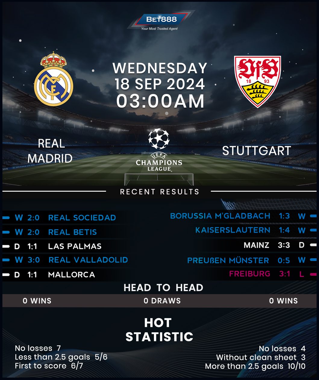 After beating Borussia Dortmund 2-0 in last term’s final to lift a record-extending 15th Champions League title, Real Madrid commence the league phase campaign against another German club. Carlo Ancelotti’s men have grown familiar with Bundesliga clubs, going unbeaten in all seven matches against such opposition in 2023/24 (W5, D2). Two second-half penalties helped Los Blancos see off Real Sociedad 2-0 at the weekend for their third win in five La Liga matches this season (D2), bolstering their spirits ahead of this clash. The Spaniards will expect nothing less than three points as they return to the Santiago Bernabeu, where they’ve not lost in the Champions League since April 2022 (W10, D3). On top of that, they’ve only suffered one defeat in their last 23 home encounters against German visitors at Europe’s top table (W17, D5).