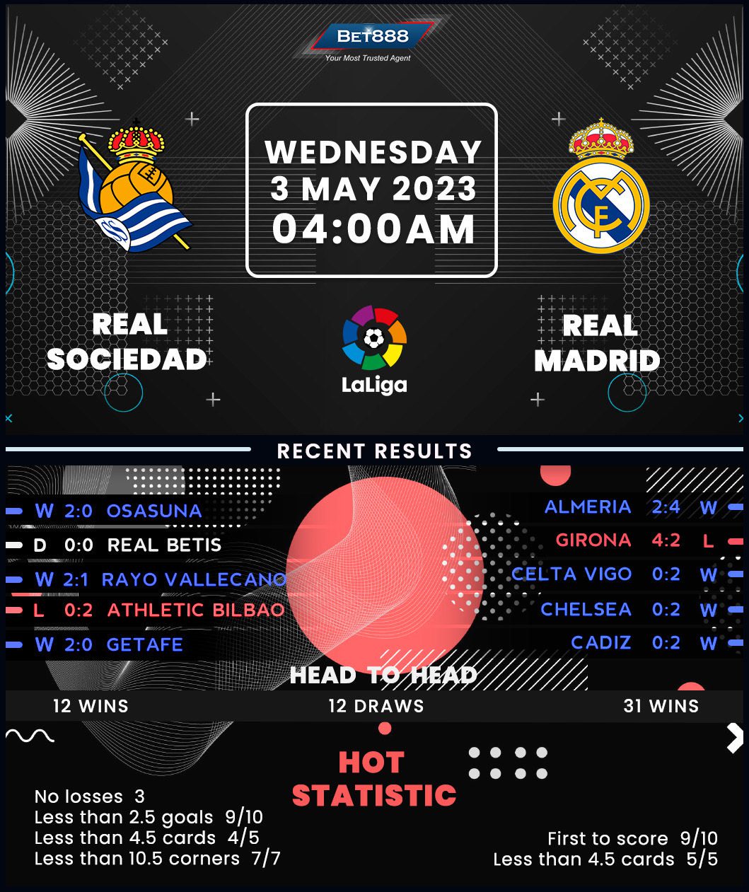 Meanwhile, crippled by suspensions and injuries, Real Madrid will be looking to build on an overwhelming 4-2 home win over Almeria last weekend and seal Champions League qualification with five games to spare. With a long-awaited Copa del Rey title decider against Osasuna around the corner, Carlo Ancelotti may opt to rest some first-team regulars against a Sociedad side his men haven’t lost to in any of their last three H2Hs in San Sebastian (W2, D1). Yet after succumbing to a dreadful 4-2 defeat to promoted Girona on their most recent La Liga travel, ‘Los Merengues’ risk losing consecutive away league matches for the first time this term. Vinicius Junior’s absence to a yellow-card ban could be a good omen, with Madrid winning all three competitive games without the Brazilian in the matchday squad in 2022/23.