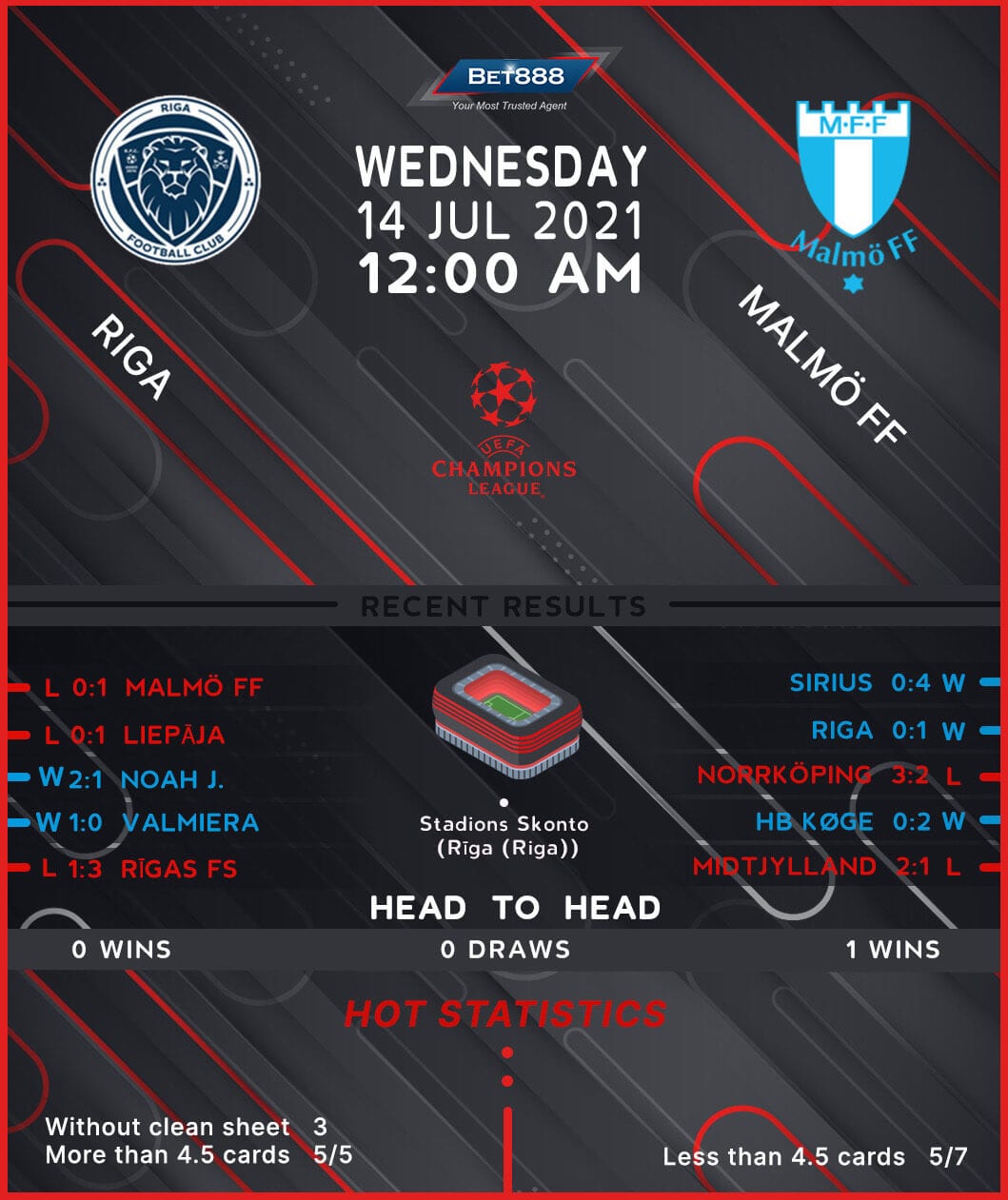 Riga have a mountain to climb as they take on Malmo in the return leg of their Champions League qualifying tie at the Stadions Skonto, hoping to overturn a 1-0 first-leg deficit.