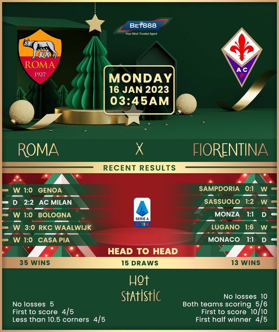 Roma followed up a dramatic 2-2 league draw at AC Milan, in which they hauled back a two-goal deficit beyond the 85th minute, with a hard-earned 1-0 home win over second-tier Genoa in midweek Coppa Italia action. However, Jose Mourinho’s men cannot be proud of their recent Serie A form after picking up just one win in their last five league outings (D3, L1). That was a 1-0 beating of Bologna in their 2023 Serie A opener, which helped I Giallorossi end a dismal three-game winless league form at the Olimpico (D1, L2). Looking to win consecutive top-flight games on home turf for the first time since October, Roma can fall back on an eye-catching eight-match league form against Fiorentina (W5, D2, L1).