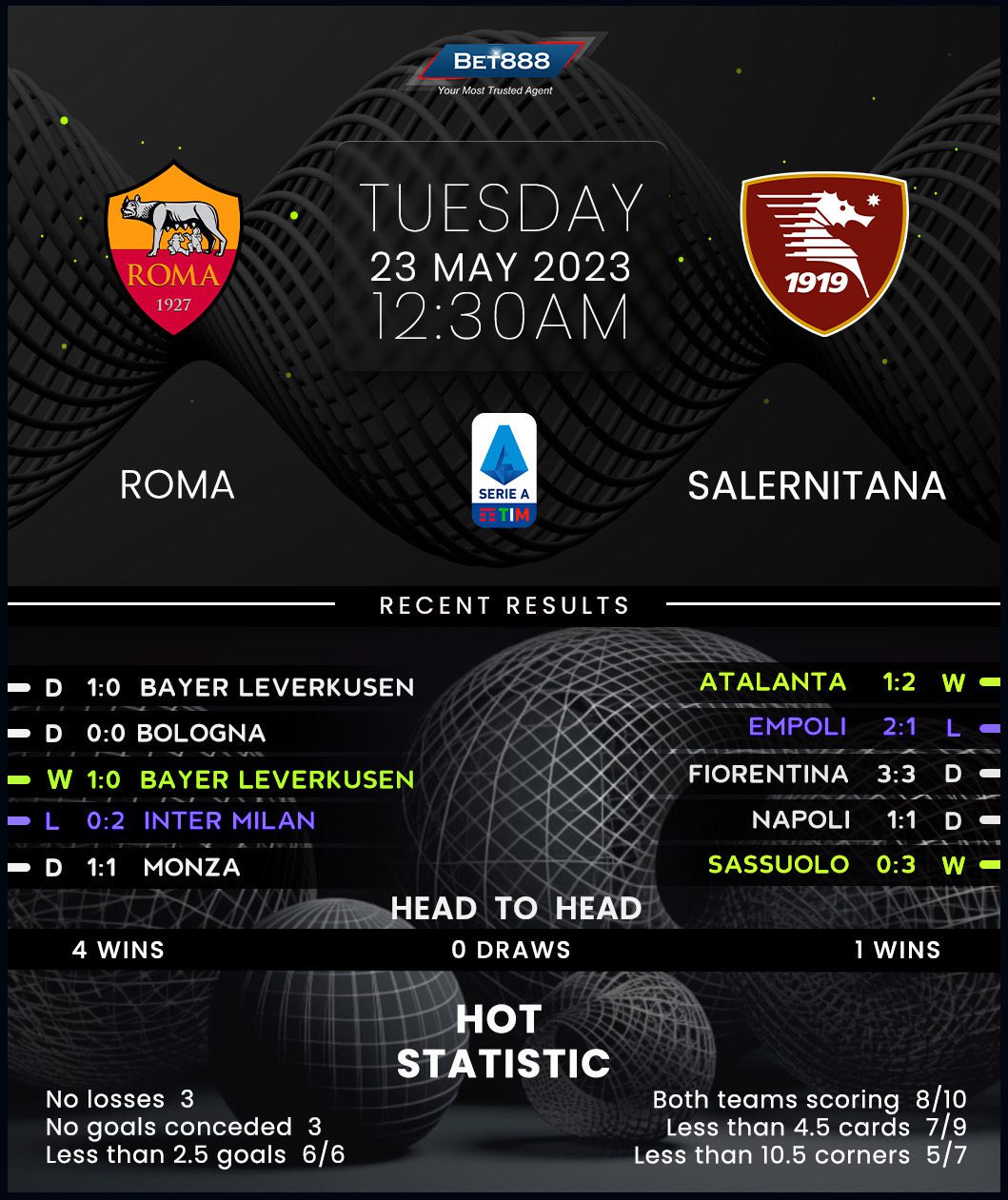 On the other hand, Salernitana grabbed a late 1-0 home win over Atalanta last time out to end a three-match winless run in Serie A (D2, L1) and ensure a third consecutive top-flight season with three games to spare. Paulo Sousa’s men have been one of the poorest travelers in Serie A in 2023, picking up just one win on their nine league road trips this calendar year (D4, L3). The visitors are winless in their last seven away league games (D5, L2) and could set an unwanted piece of club history if they fail to bounce back in Rome. The last time they went winless on eight straight top-flight travels was in 1999. Conceding first would significantly derail Salernitana’s hopes of upsetting the apple cart at the Olimpico, given that they’ve failed to win ten of their 11 away league matches after falling behind this term (W1, D3, L7).