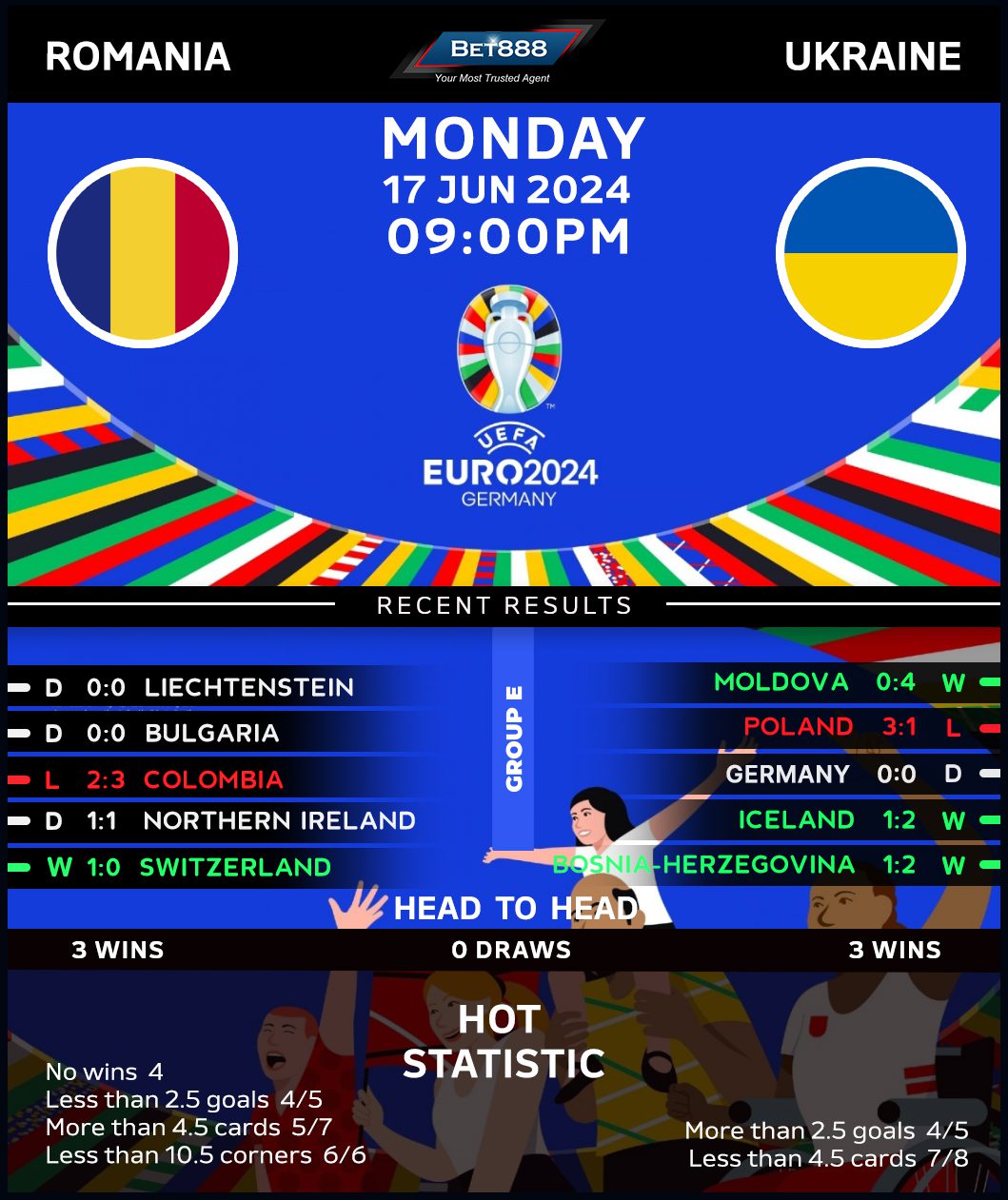 Romania’s form in warm-up fixtures has been far from inspiring, with back-to-back 0-0 draws against Bulgaria and Liechtenstein extending their winless run to four matches (D3, L1). Perhaps returning to competitive action would be a spark the Tricolours need, having not lost a competitive fixture since a 3-0 defeat to Montenegro in June 2022 (W7, D5). But stretching that run with an eighth victory would require Romania to defy an unwanted piece of history that has seen them fail to win any of their five previous European Championships openers (D3, L2). Manager Edward Ioardanescu can’t draw much confidence from Romania’s recent encounters against Ukraine, with two of their last three ending in defeats in regulation (D1). But as all three matches saw both teams score at least twice, connoisseurs of action-packed football will look forward to this meeting.