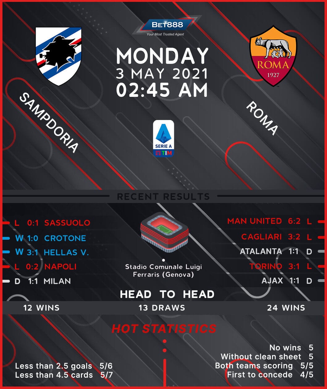 None of Sampdoria’s last four Serie A games has ended level (W2, L2) since a 1-1 draw at AC Milan on Matchday 29, with three of the four results (win/loss) in this sequence seeing the winner on the day preserve a clean sheet. However, ‘I Blucerchiati’ have lost four of their last five Serie A matches against Roma (D1), as many defeats as they had in their previous 12 H2Hs in the competition. Furthermore, Sampdoria have drawn a blank in three of their last four league meetings with this opposition, scoring a consolation goal in a 2-1 loss at the Stadio Olimpico in June 2020. Claudio Ranieri’s men have struggled to cope with the division best sides this season, having lost seven of their last eight home Serie A games versus teams starting the day in the top-seven in the standings (W1).