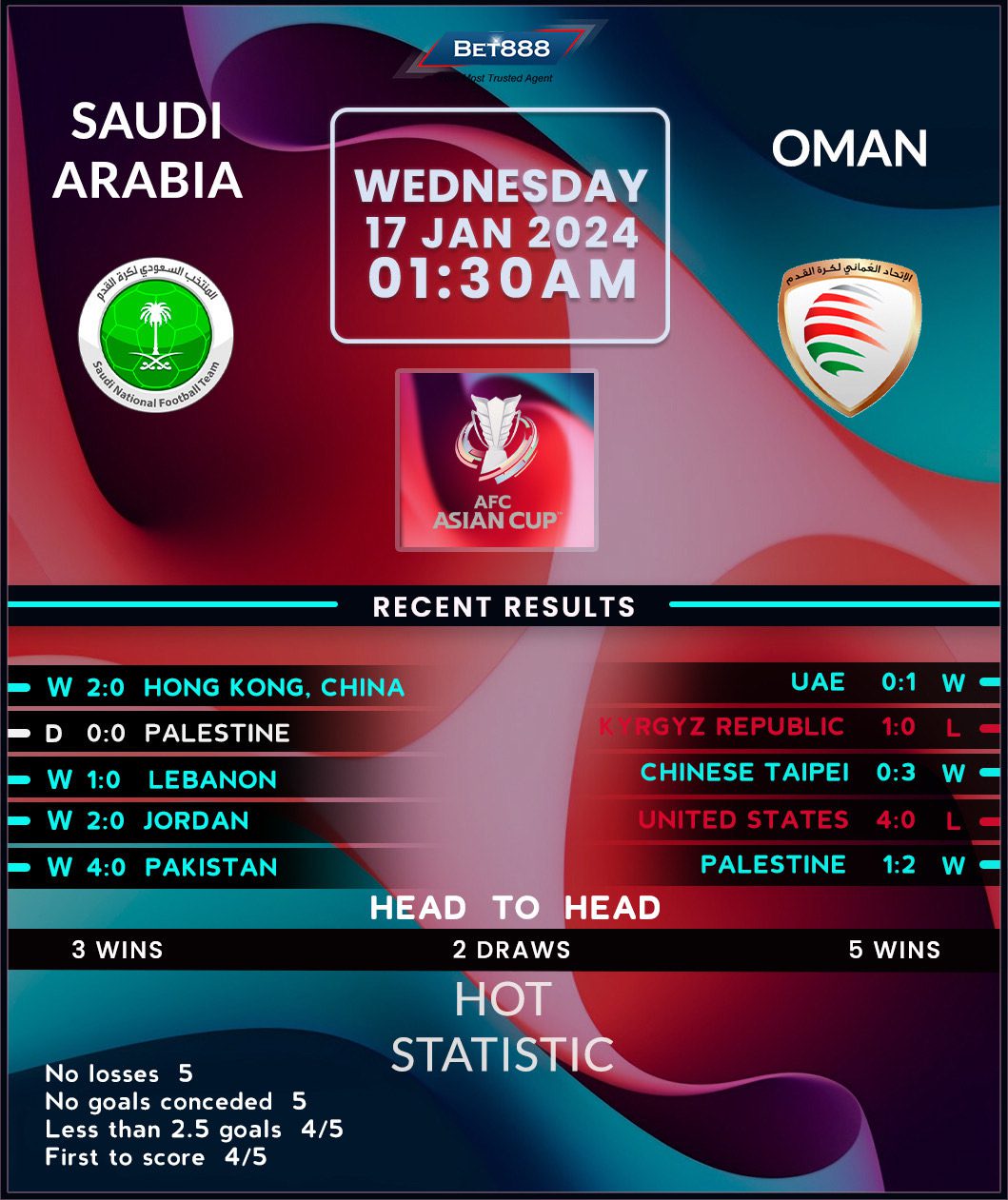 In the meantime, Oman’s third successive Asian Cup appearance comes with high expectations, especially after the nation’s first-ever knockout qualification in the previous tournament. The ‘Reds’ have fared well in the build-up to the competition, racking up three wins in four internationals (L1), including an emphatic 3-0 victory against Chinese Taipei in their opening 2026 World Cup qualifier. Oman enjoyed a stellar start to 2024, defying the odds to beat the more heavily fancied United Arab Emirates 1-0. That success highlights the importance of scoring the opening goal, as does the fact seven of their last eight international triumphs have come ‘to nil.’ However, that’s an accomplishment they’ve fallen short of in four straight matches against Saudi Arabia after four consecutive H2H clean sheets beforehand.