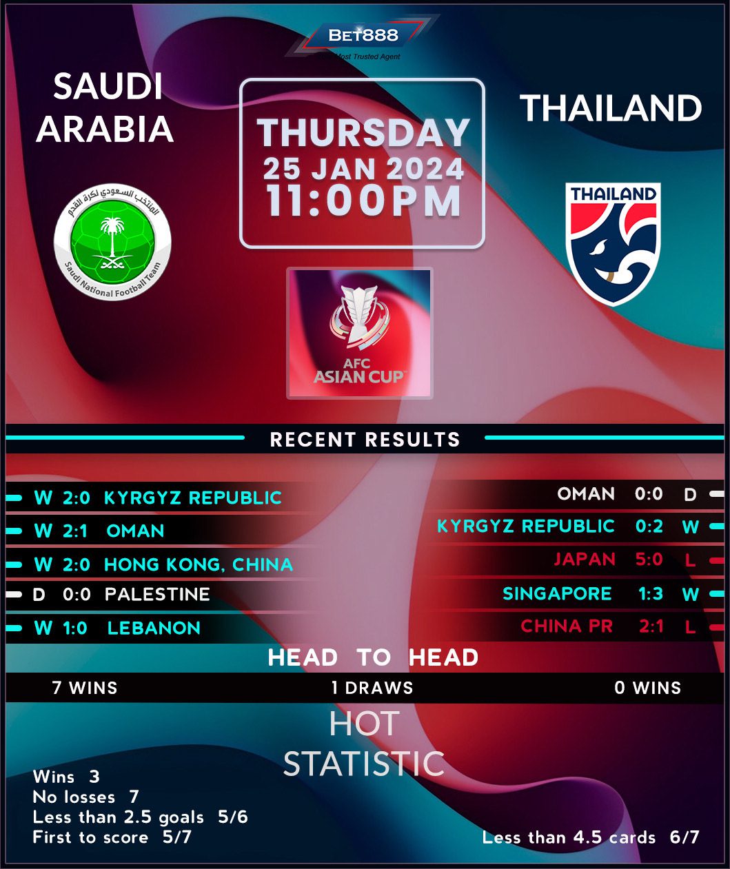 It’s been one hell of a start to the 2023 Asian Cup for Saudi Arabia as victories over Oman and Kyrgyzstan, 2-1 and 2-0, respectively, fired them into the knockout stages with a game to spare. Avoiding defeat against Thailand would secure a top-place finish in Group F, which should be a mere formality, considering the Saudis have won their last three H2Hs ‘to nil.’ Adding to Roberto Mancini’s confidence, his men have gone unbeaten in seven consecutive internationals (W6, D1) since a 3-1 friendly loss to Mali in October 2023, conceding just once in that sequence. Equally significant is the fact the ‘Green Falcons’ have rediscovered their scoring touch, netting precisely two goals in their last three outings.
